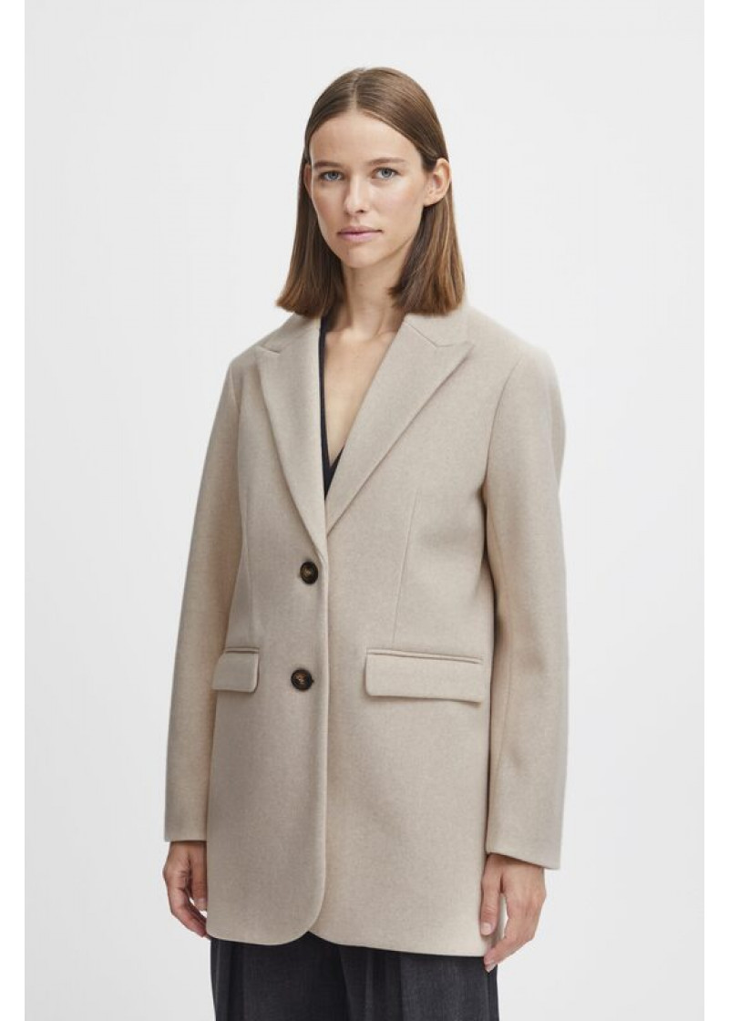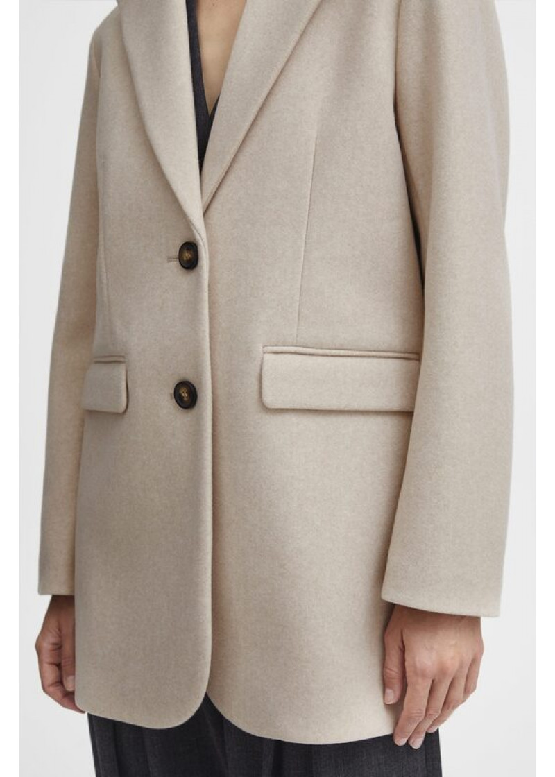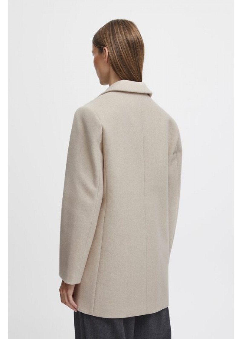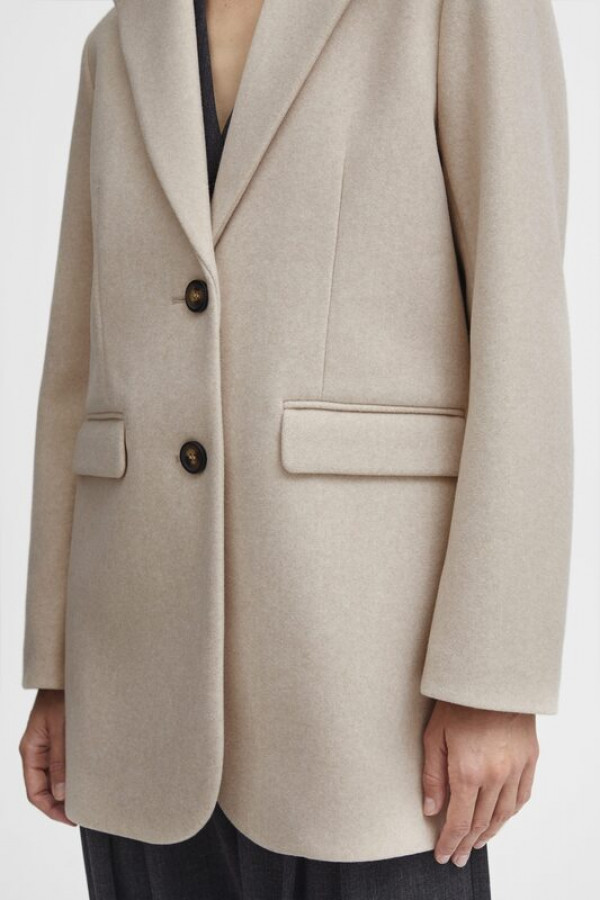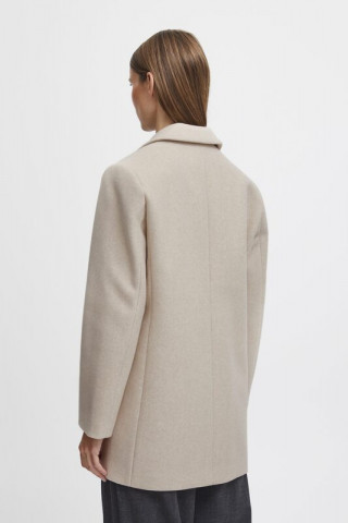 Opis: Kratak ženski kaput u bež boji sa reverima, prednjim džepovima i kopčanjem na dugmiće