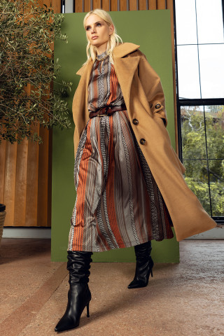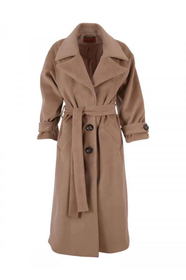 Opis: Dugačak ženski kaput u kamel boji sa reverima i kaišem