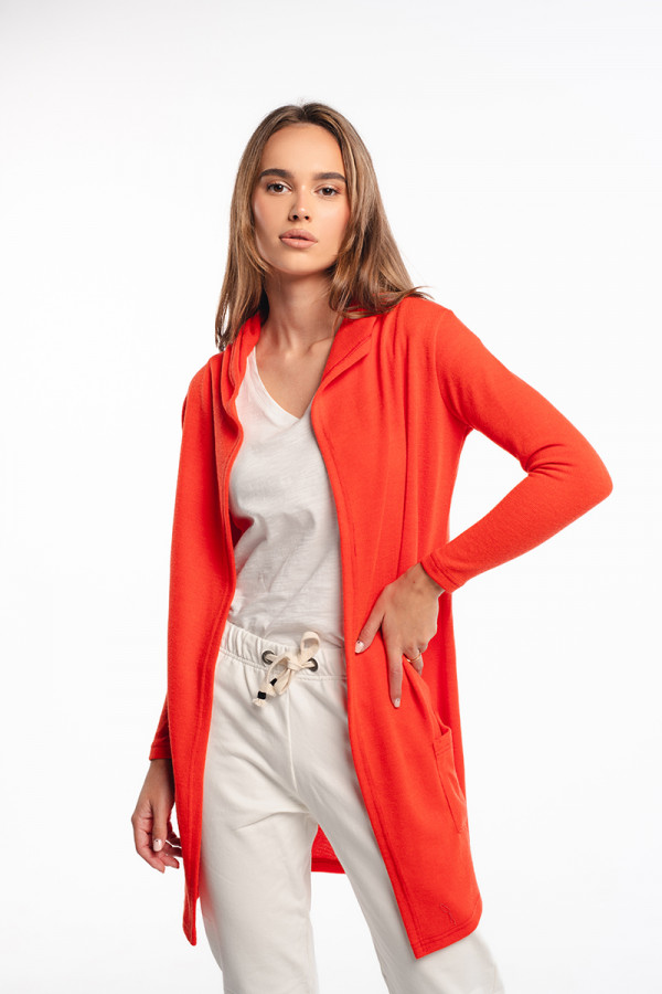 Opis: Žesnki kardigan u narandžastoj boji sa kapuljačom i džepovima