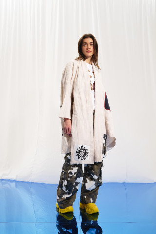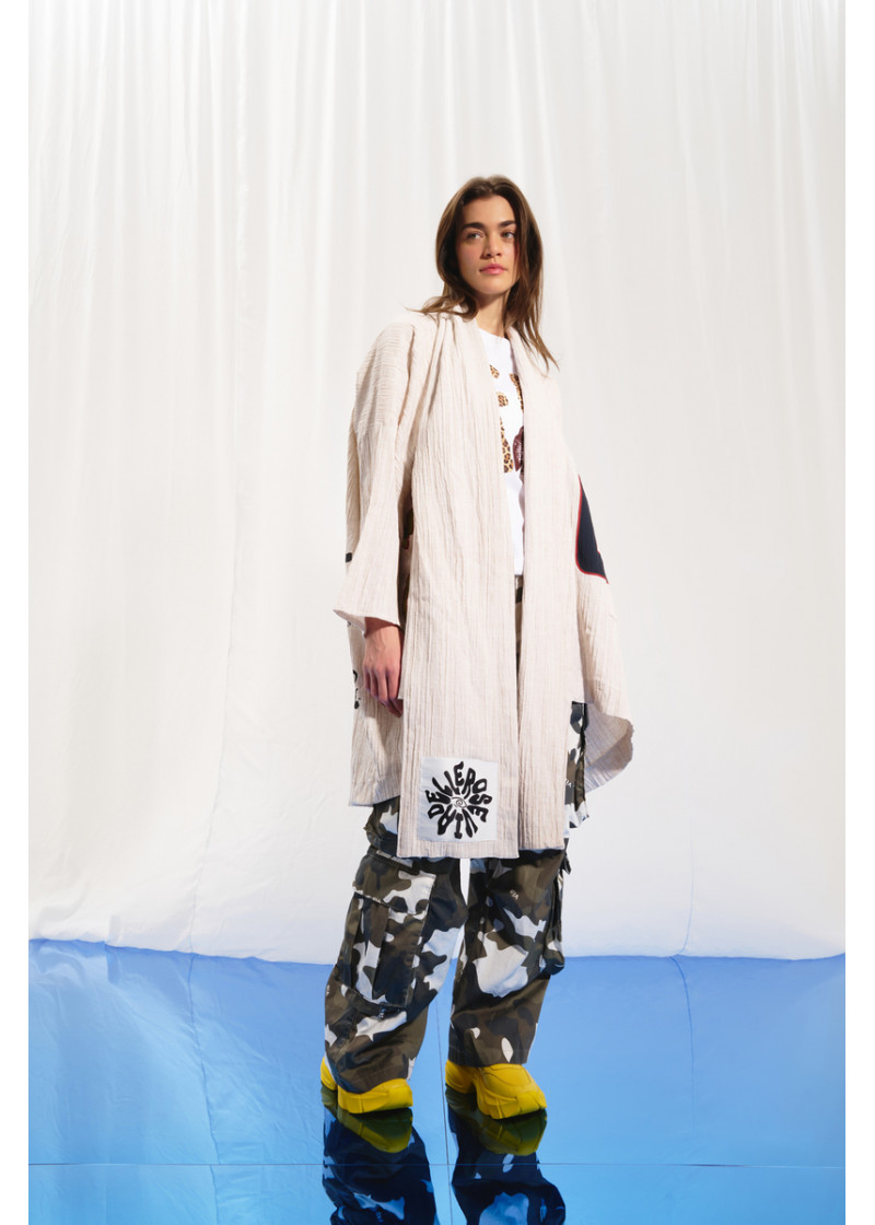 Opis: Ženski oversized kardigan u bež boji sa printom
