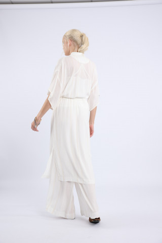 Opis: Dugačak ženski kimono u beloj boji sa metaliziranim nitima i kaišem