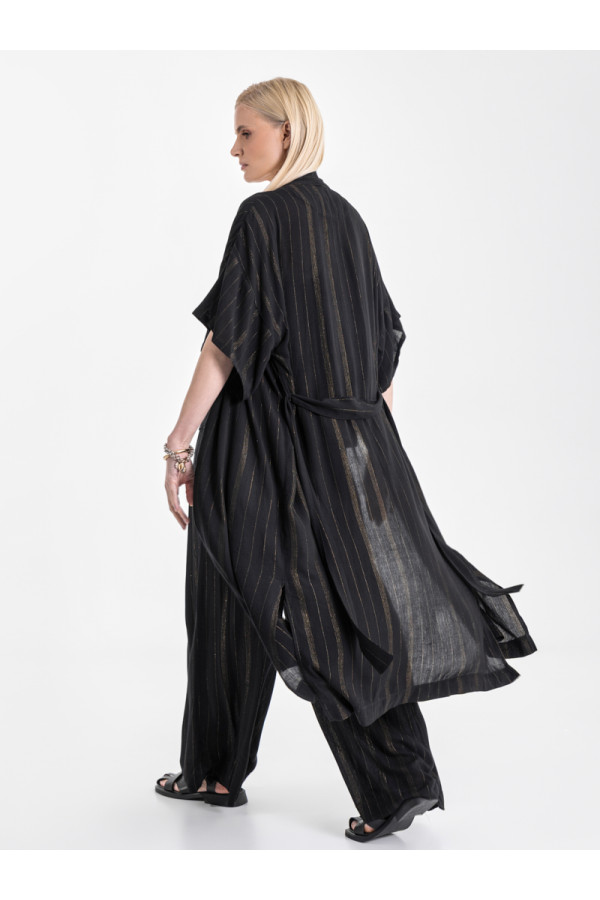 Opis: Dugačak ženski kimono u crnoj boji sa metaliziranim nitima i kaišem