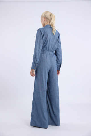 Opis: Ženski kombinezon u denim boji sa dugim rukavima, lastiš pojasom i širokim nogavicama