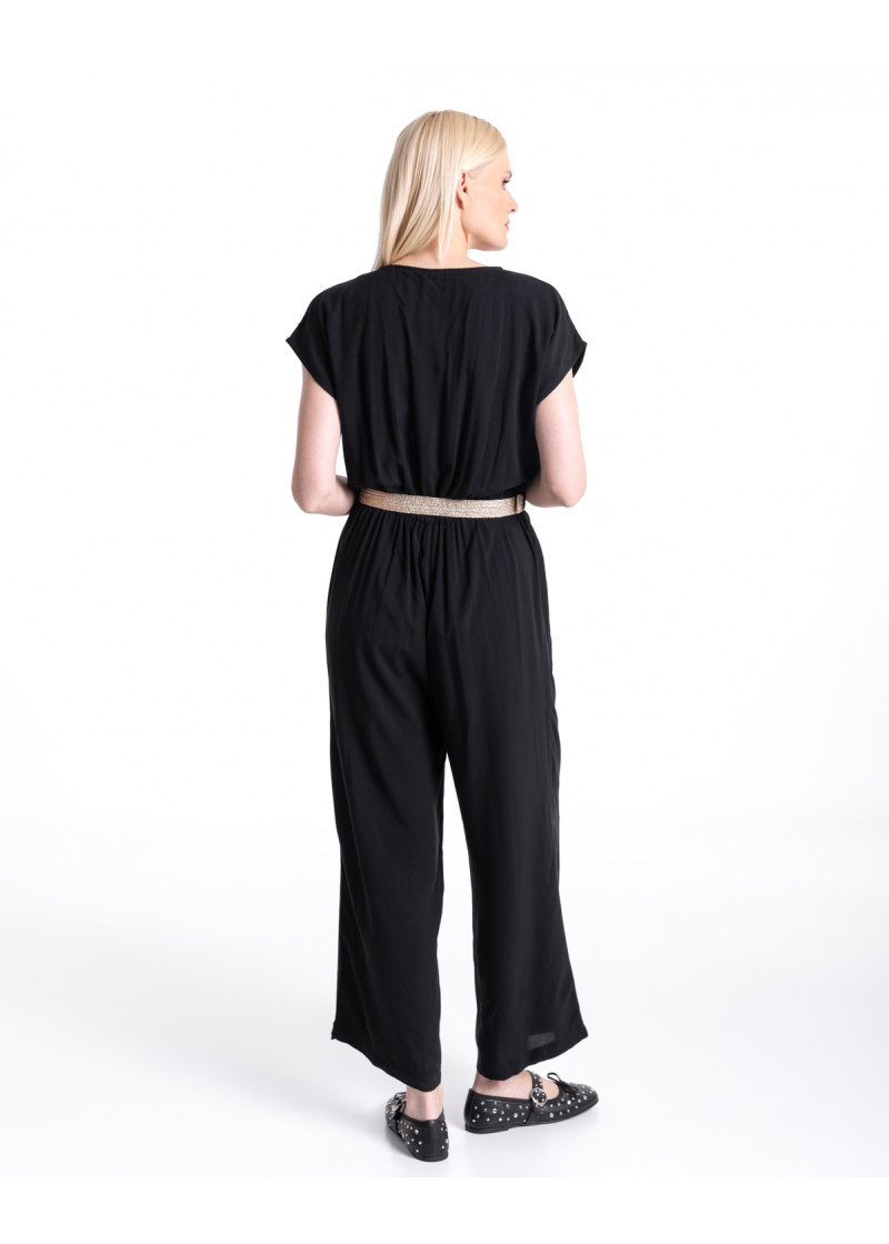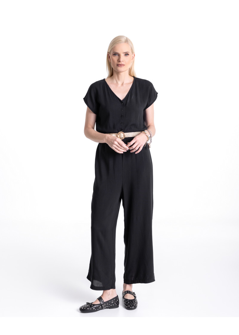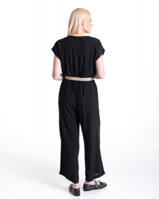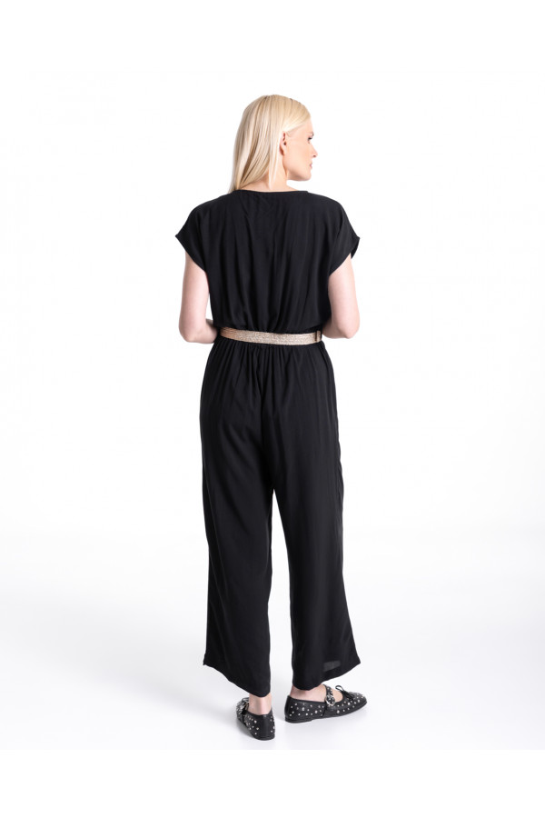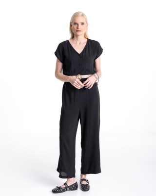 Opis: Ženski kombinezon od viskoze u crnoj boji sa kratkim rukavima, V-e izrezom i nogavicama dužine 7/8