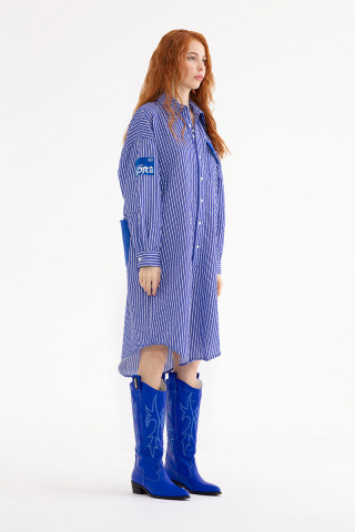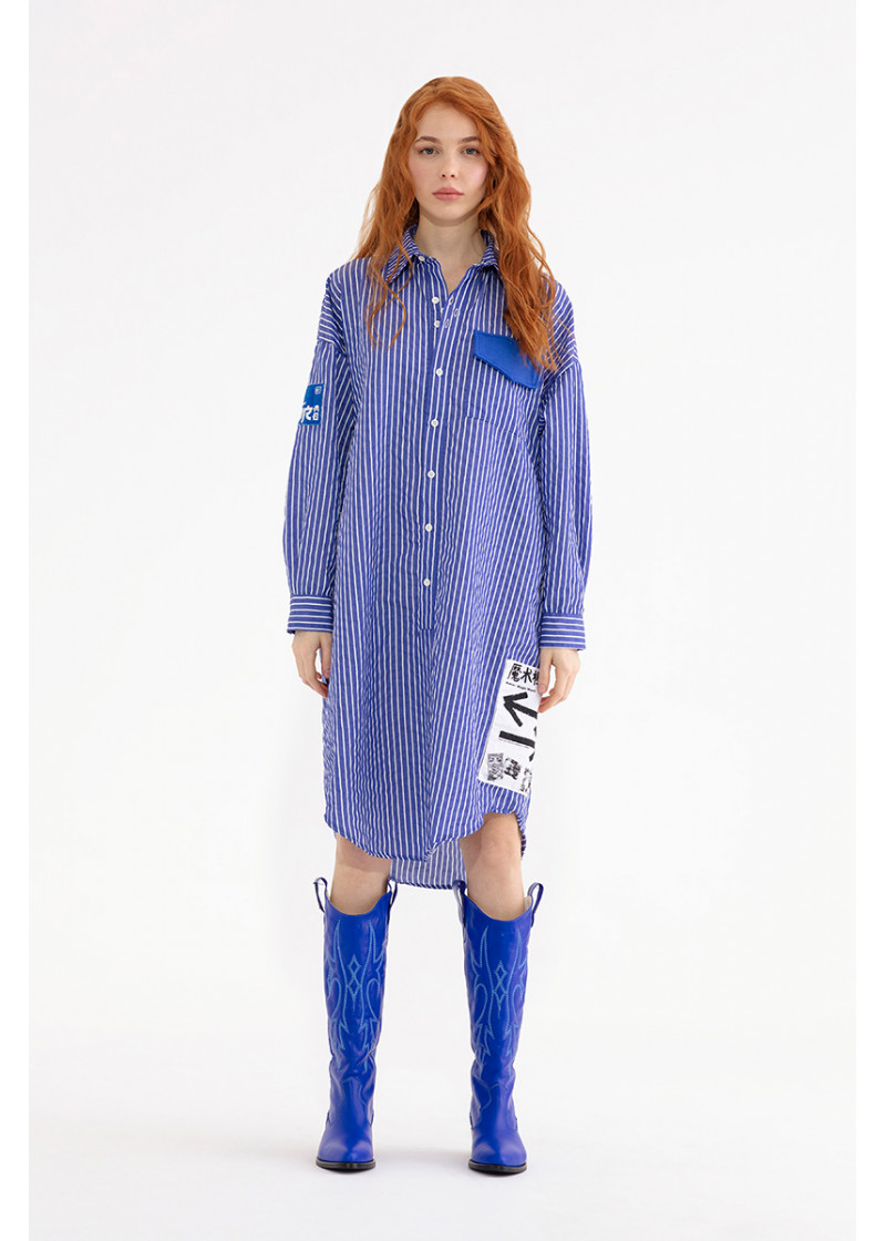 Opis: Duga ženska košulja u rojal plavoj boji prugastig dezena sa logo printom i dugmićima