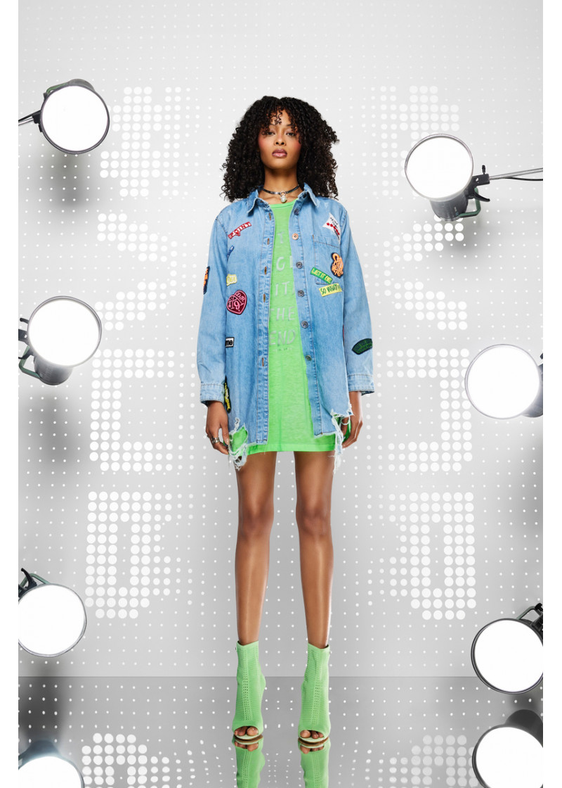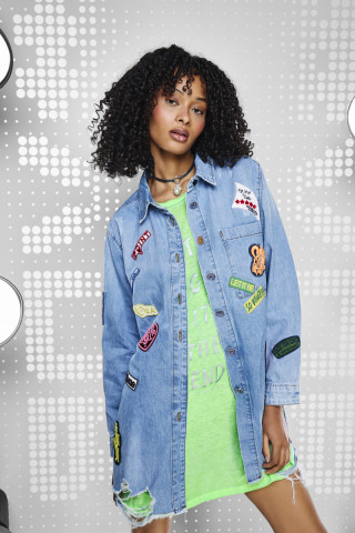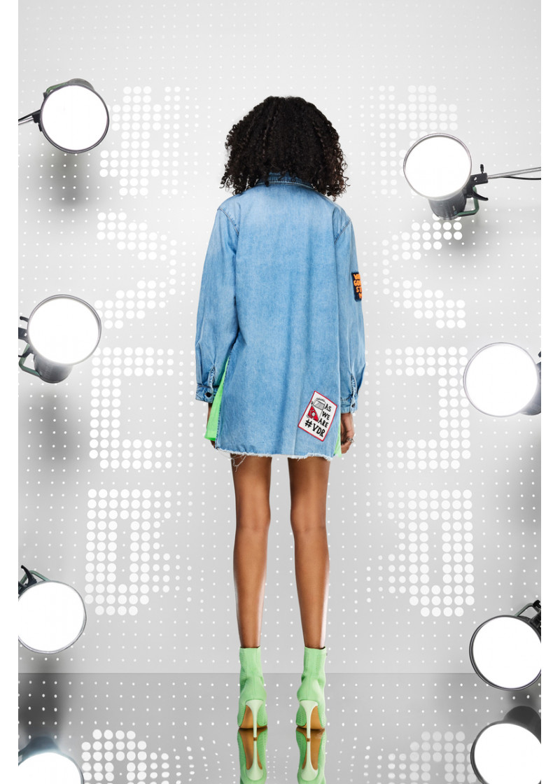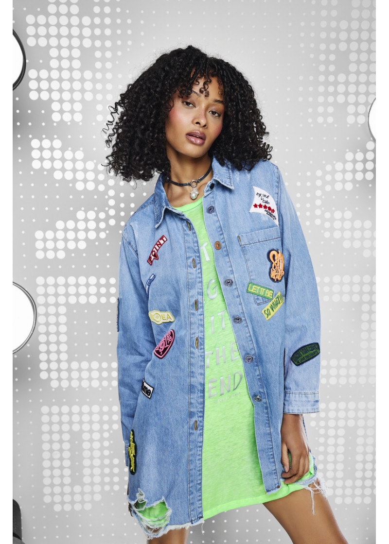 Opis: Duga ženska košulja od svetlo plavog teksasa sa dekorativnim modnim aplikacijama