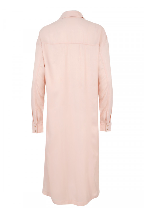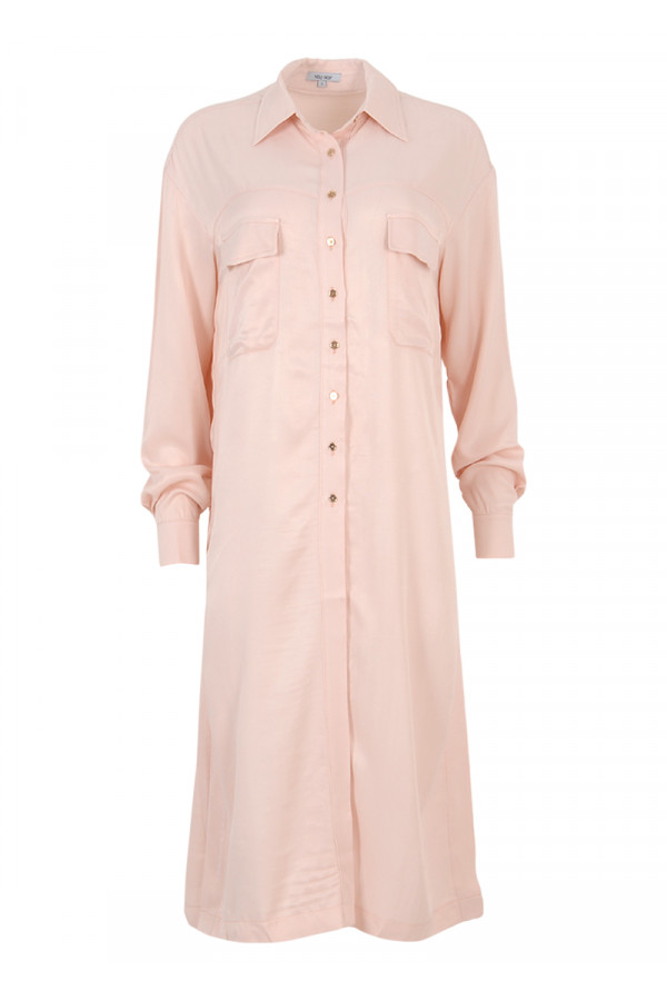 Opis: Košulja haljina u puder roza boji sa dugim rukavima, džepovima i kopčanjem na dugmiće