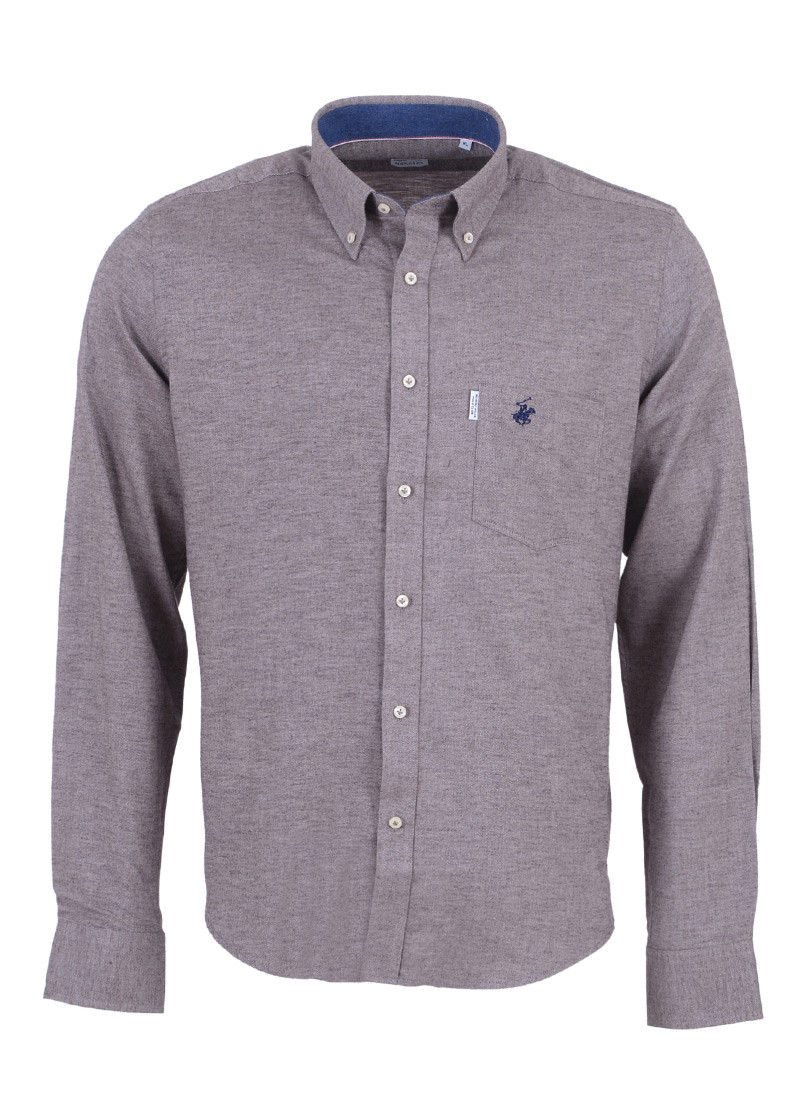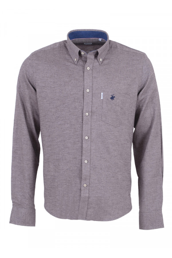 Opis: Pamučna muška košulja u braon boji sa dugim rukavima i logo aplikacijom