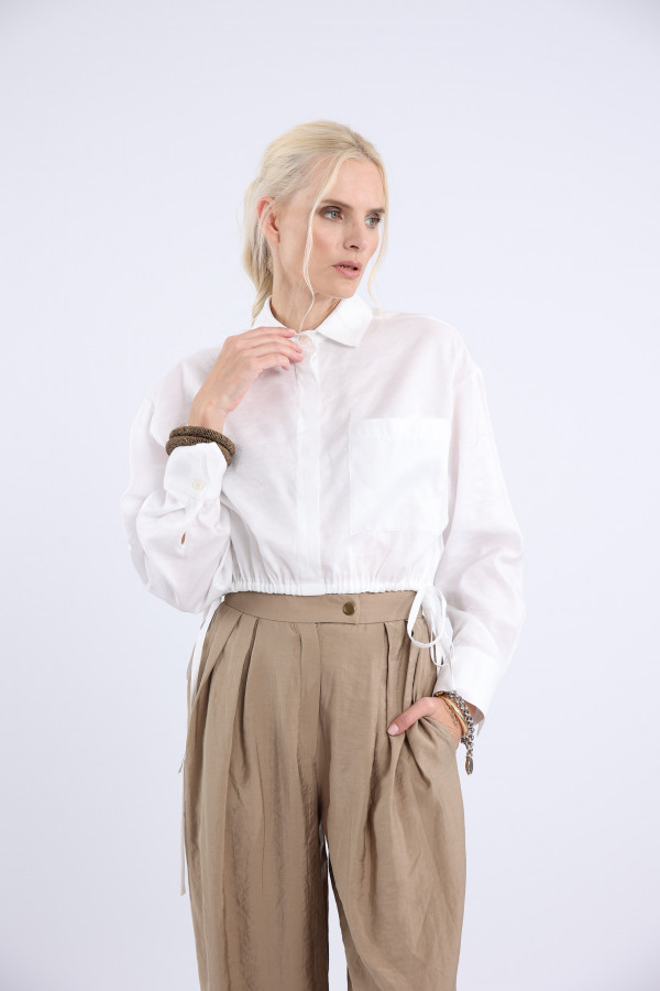 Opis: Kratka ženska košulja u beloj boji sa podesivim učkurima, kragnom i prednjim džepom