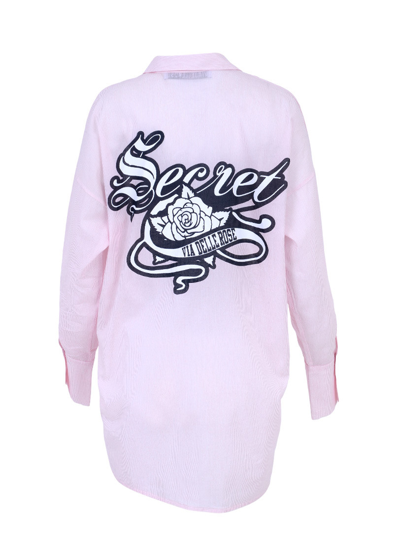 Opis: Pamučna ženska košulja u roza boji sa dugim rukavima, printom i aplikacijom na leđima