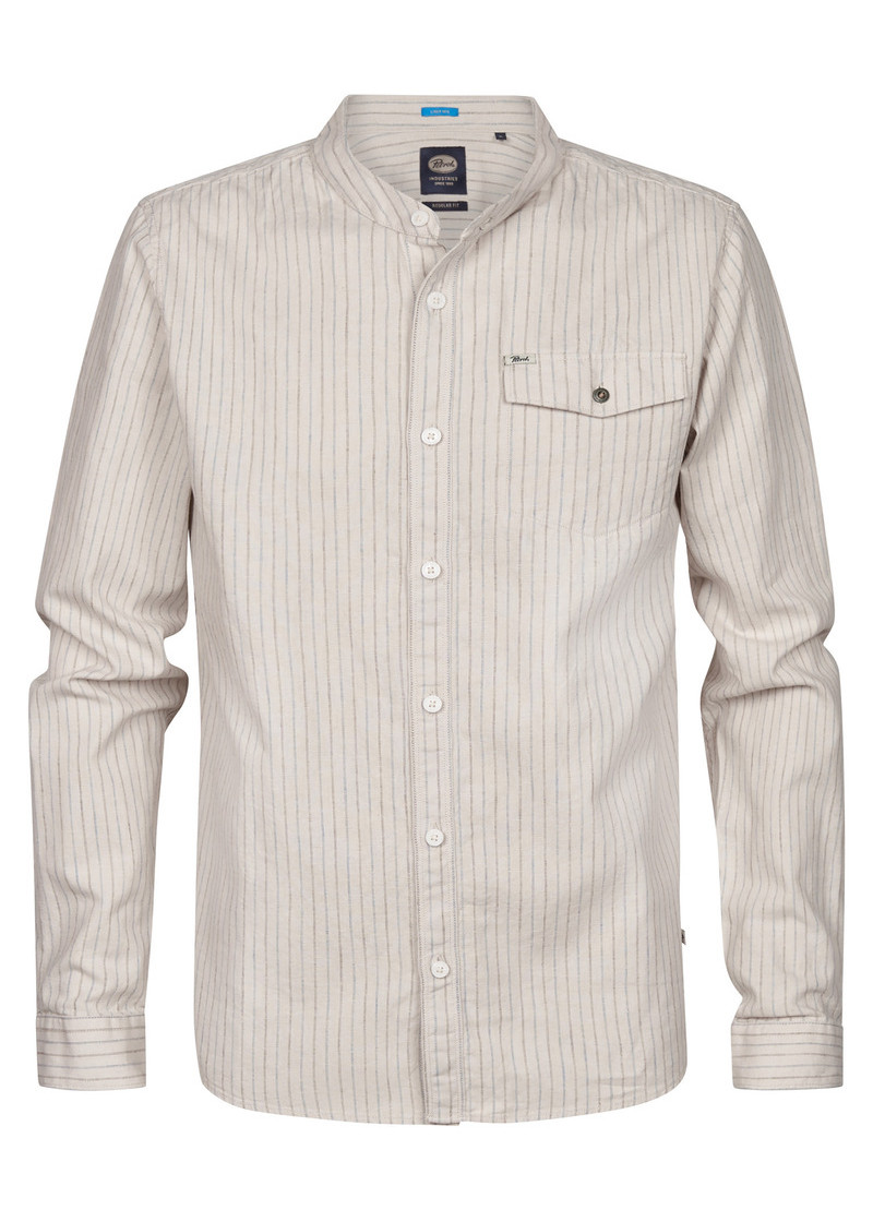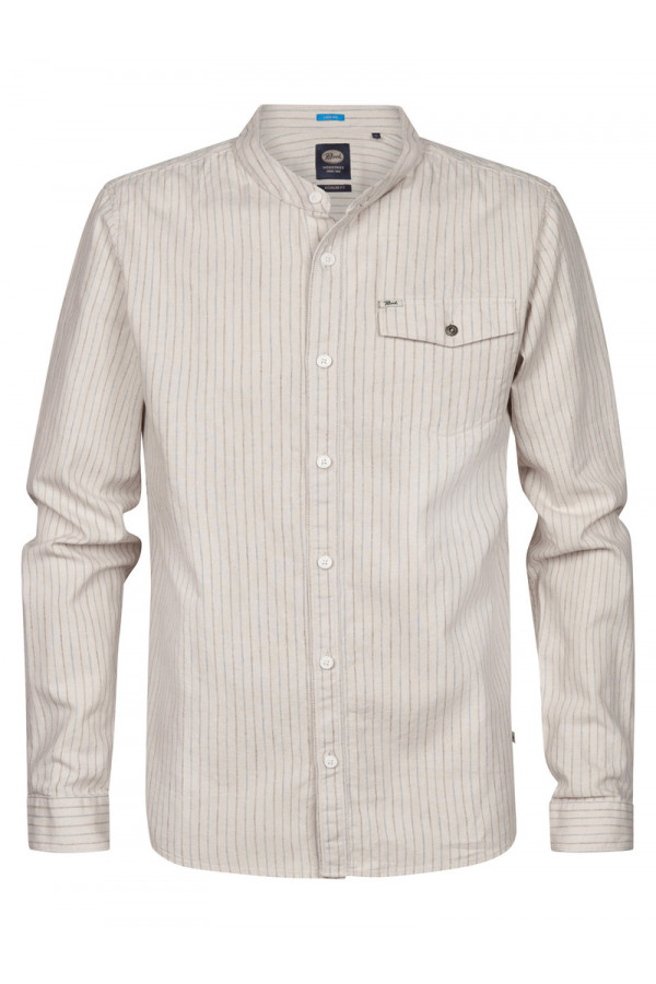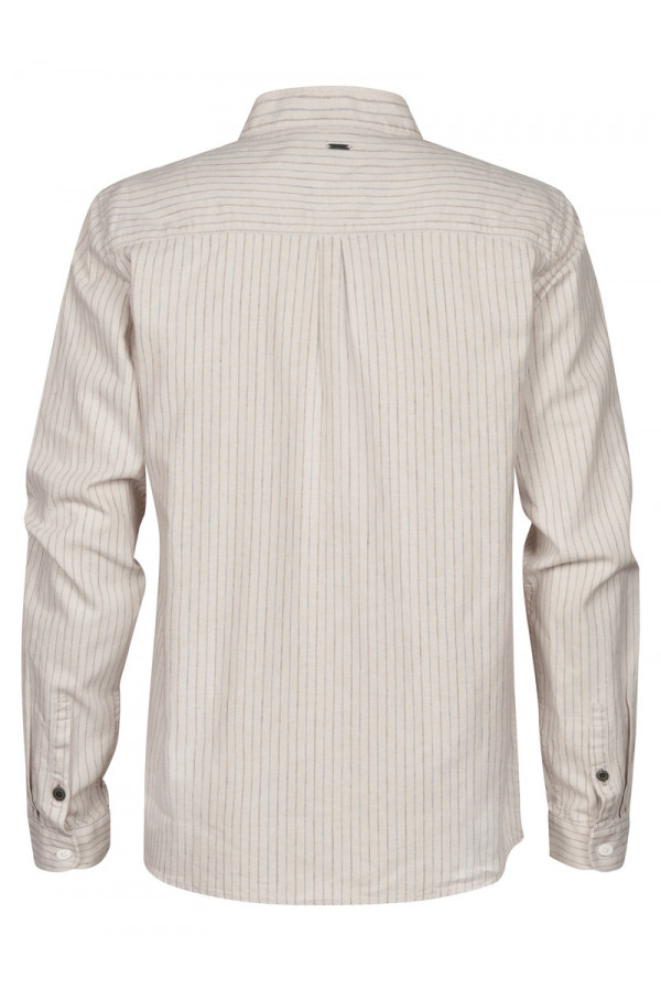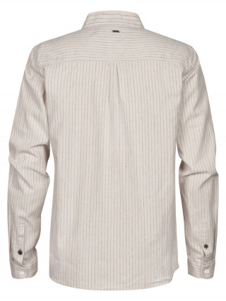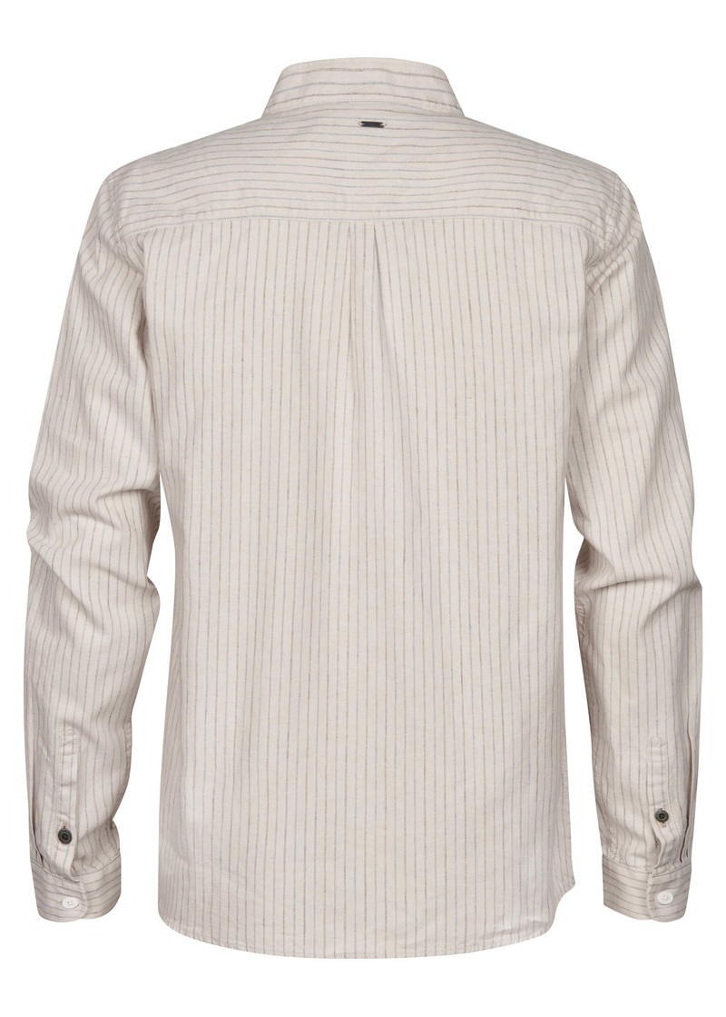 Opis: Lanena muška košulja u bež boji sa diskretnim prugama, dugim rukavima i ruskom kragnom