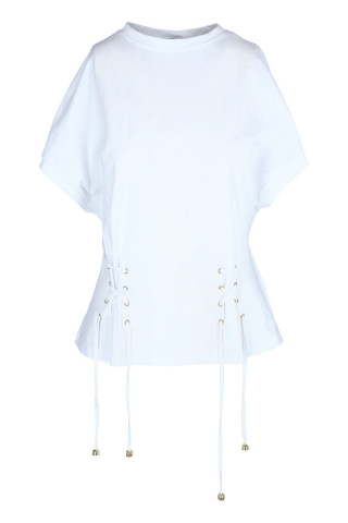 Opis: Pamučna ženska majica kratkih rukava u beloj boji sa spuštenim ramenima, zlatnim ringlicama i pertlama na prednjoj strani