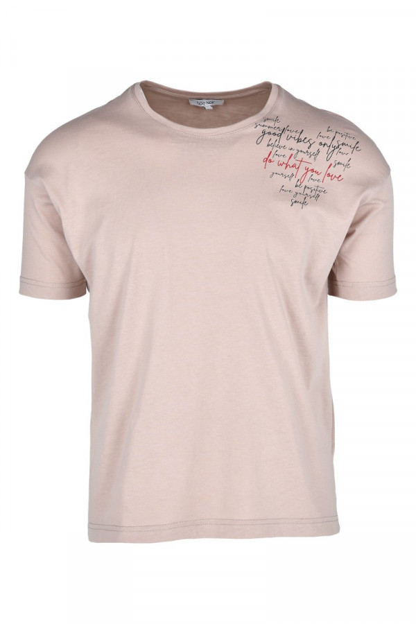 Opis: Pamučna ženska majica u bež boji sa kratkim rukavima i printom na prednjoj strani