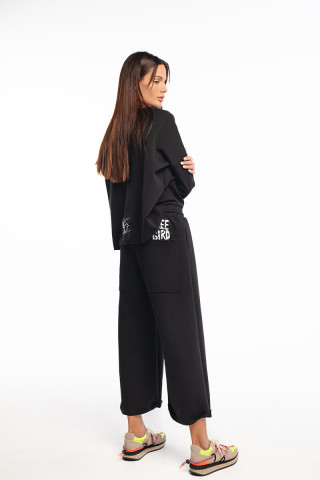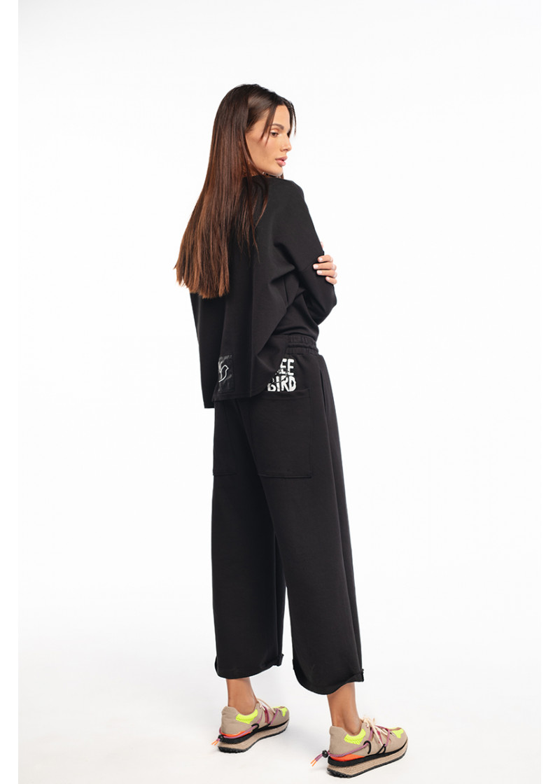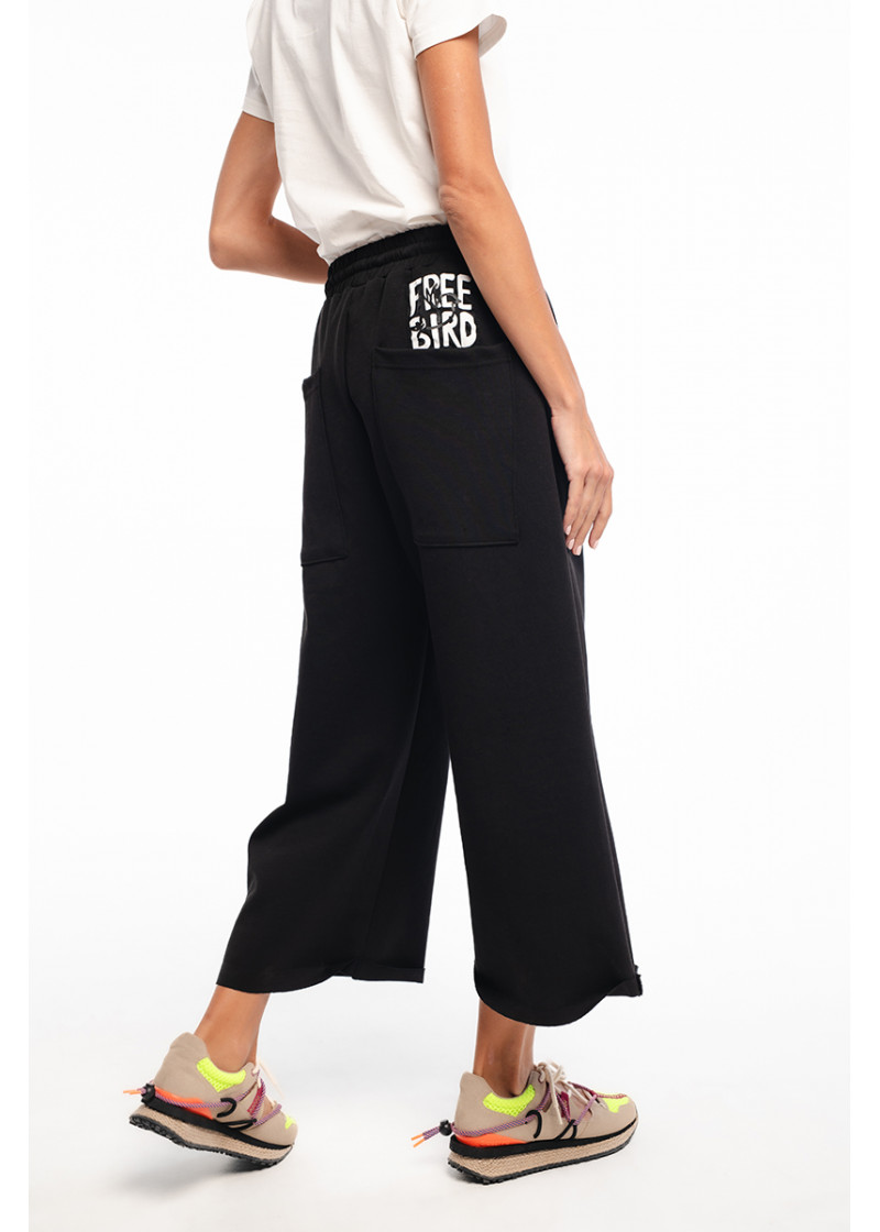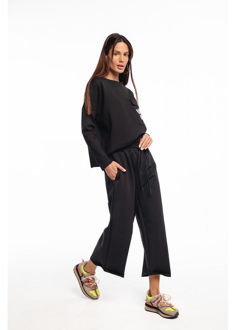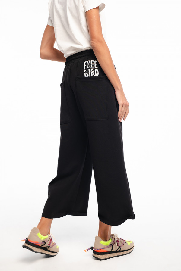 Opis: Pamučne ženske pantalone u crnoj boji sa bočnim džepovima, lastiš pojasom i nogavicama dužine 7/8