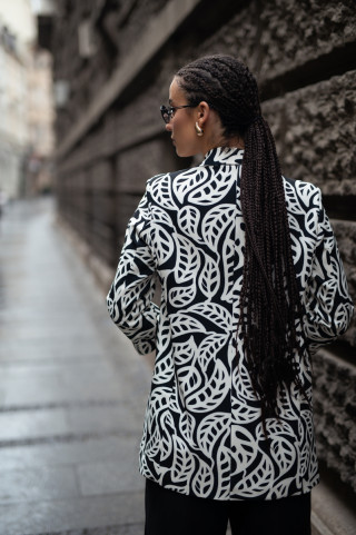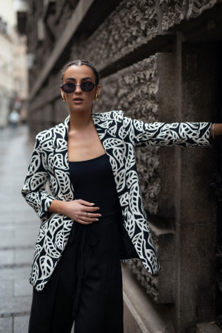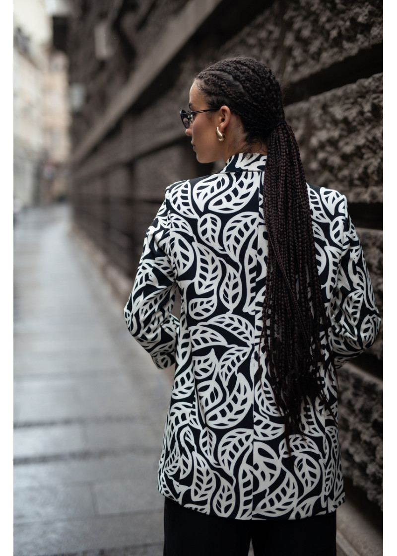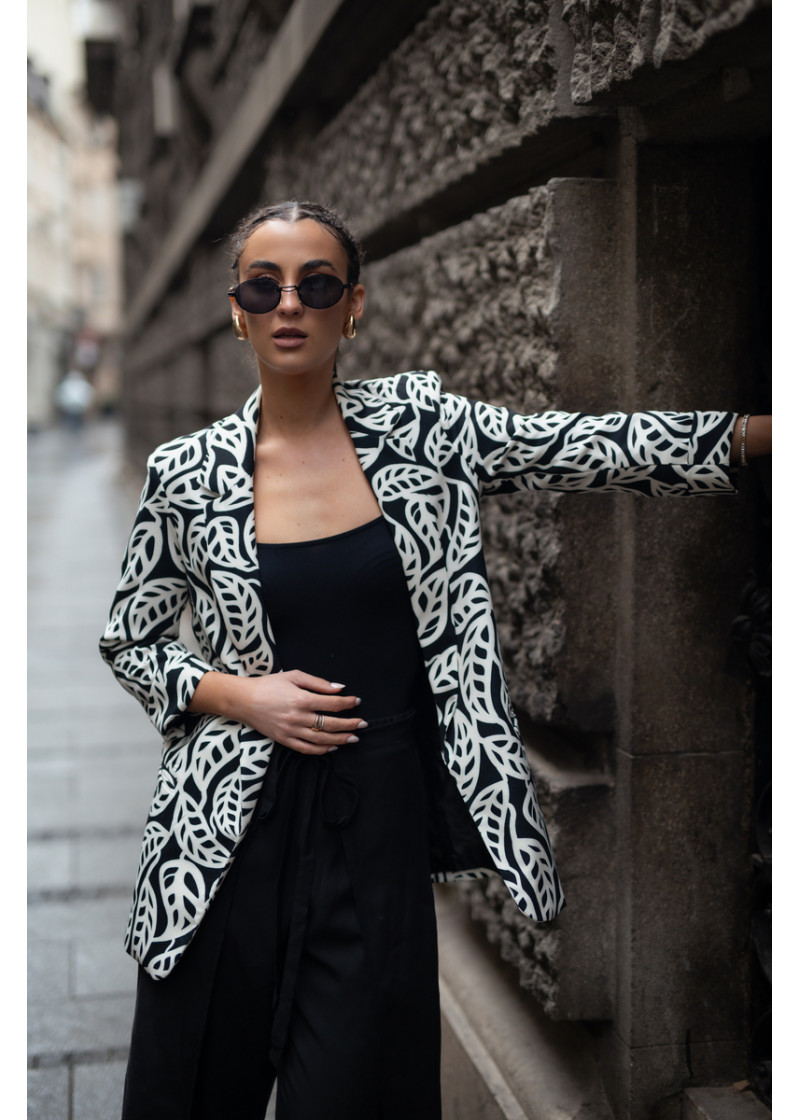 Opis: ženski duži sako ravnog kroja u crno-belom cvetnom dezenu i rever kragnom