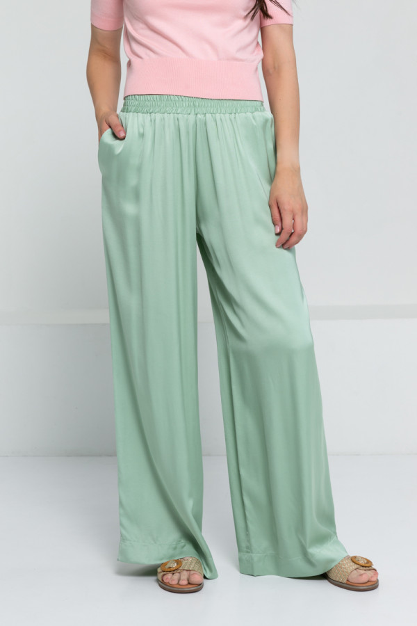 Opis: Ženske široke pantalone u mint boji sa nabranim lastiš pojasom i skrivenim bočnim džepovima