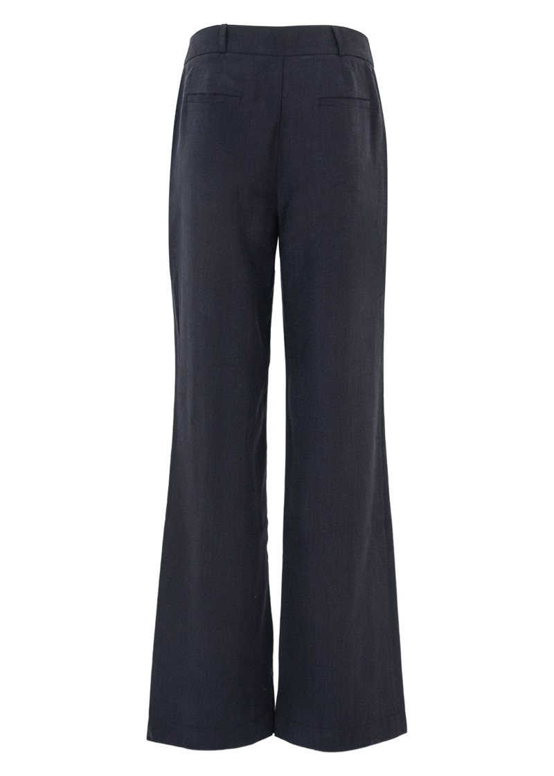 Opis: Ženske pantalone od prirodnog materijala u teget boji sa visokim pojasom i širokim nogavicama