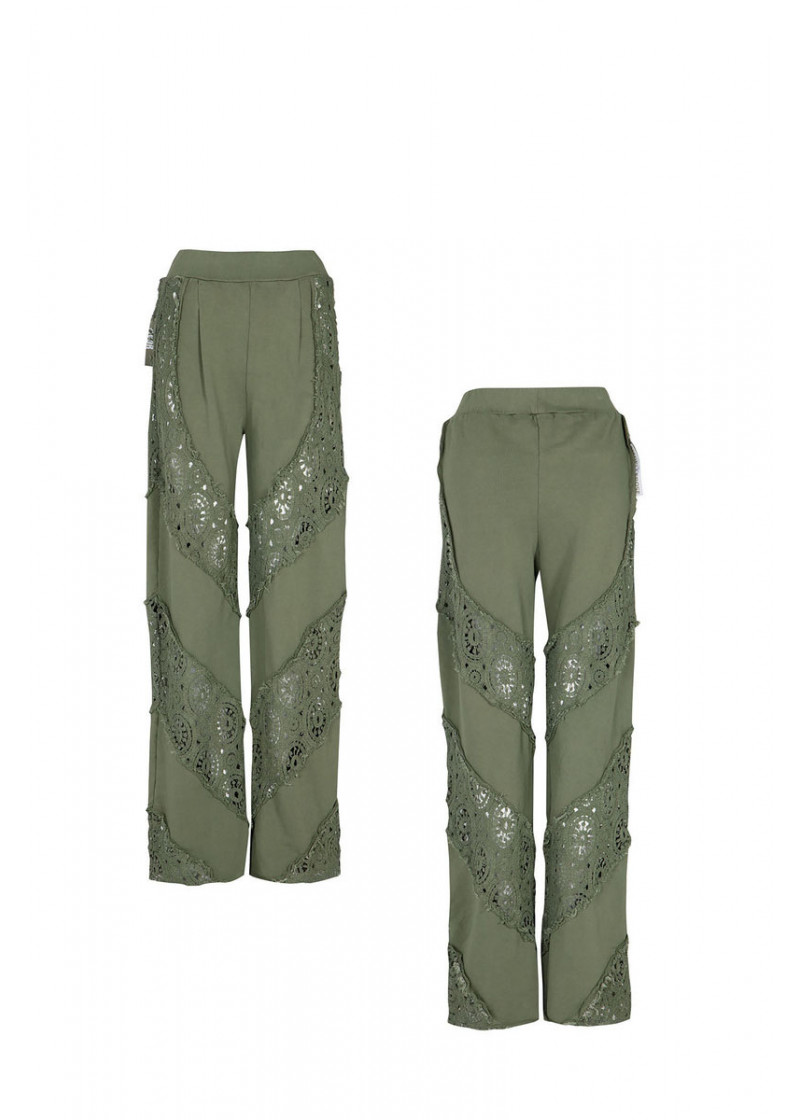 Opis: Pamučne ženske pantalone u maslina zelenoj boji sa ravnim nogavicama i heklanim rupičastim detaljima