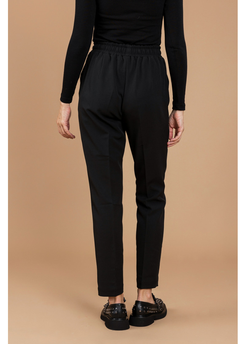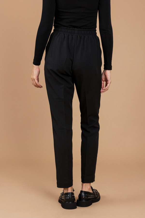 Opis: Ženske pantalone u crnoj boji sa uzanim nogavicama i lastiš pojasom