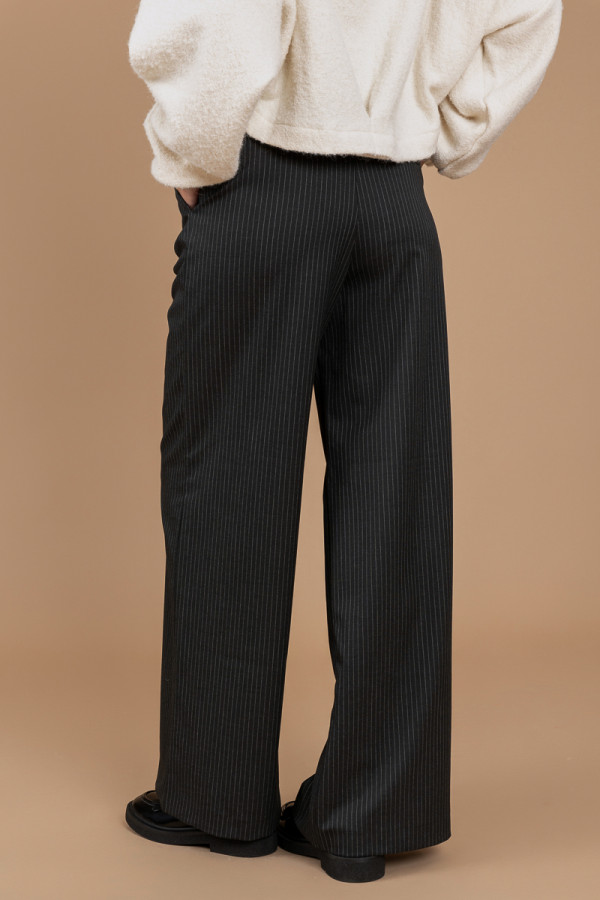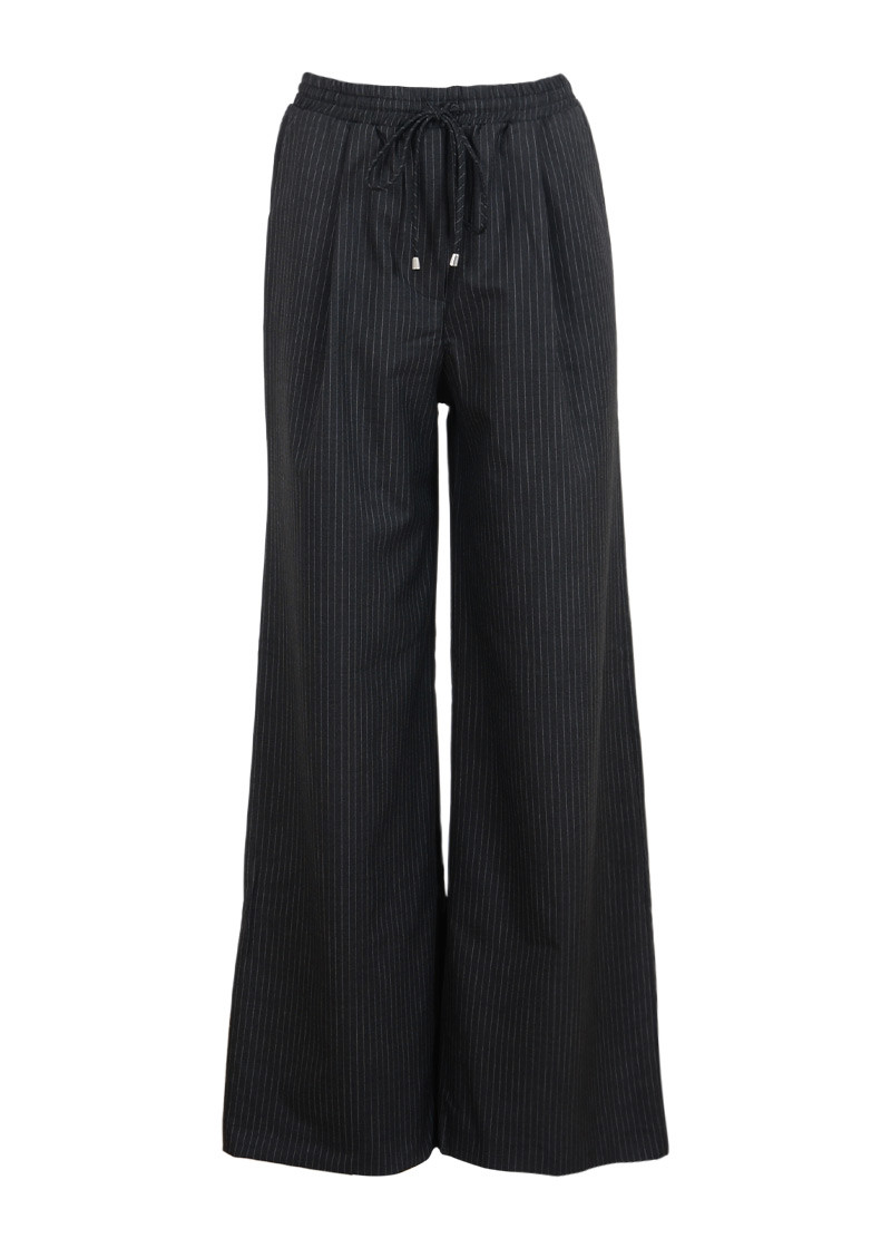 Opis: Ženske pantalone u tamno sivom prugastom dezenu sa širokim nogavicama i lastiš pojasom
