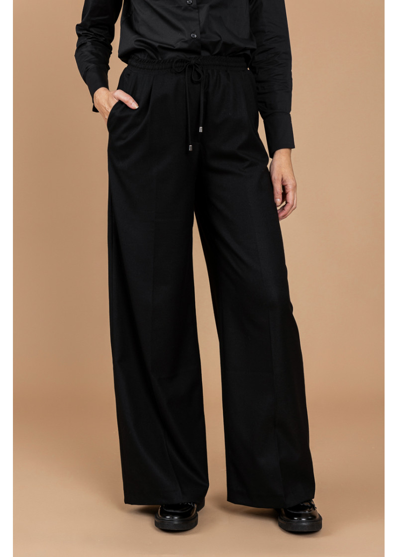 Opis: Ženske pantalone u crnoj boji sa ravnim nogavicama i lastiš pojasom