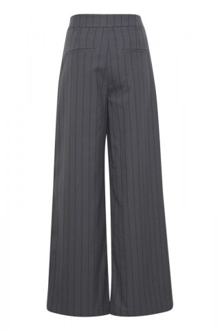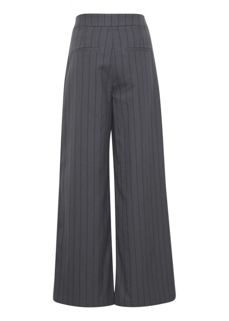Opis: Ženske pantalone u sivom prugastom dezenu sa širokim nogavicama, bočnim džepovima i visokim strukom