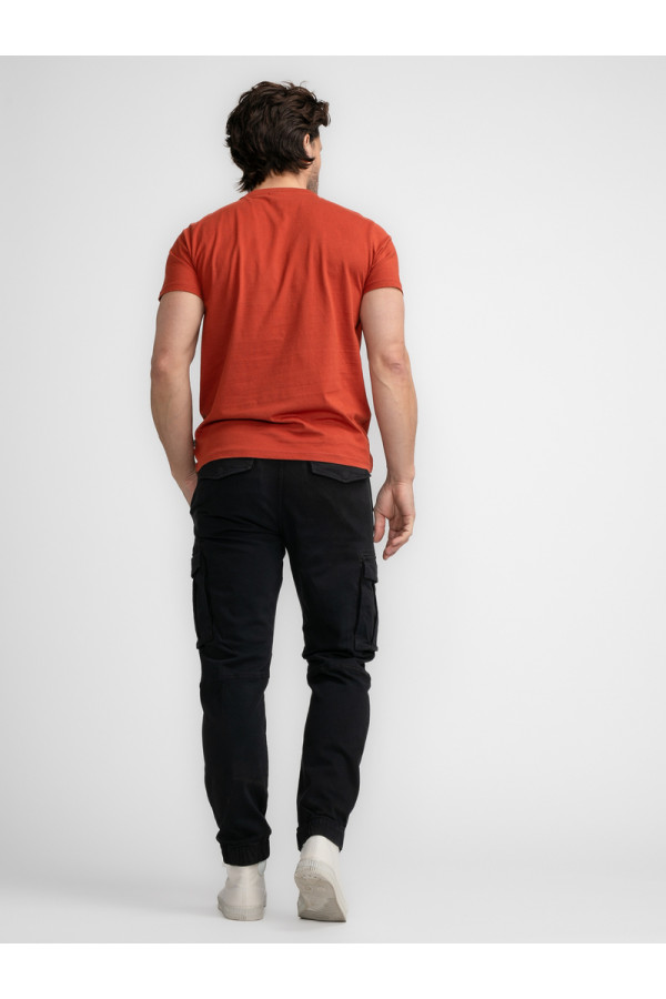 Opis: Pamučne muške kargo pantalone u crnoj boji sa učkurom na pojasu i lastišem na donjem delu nogavica