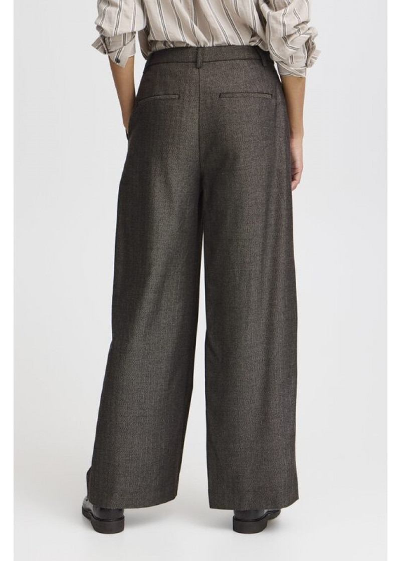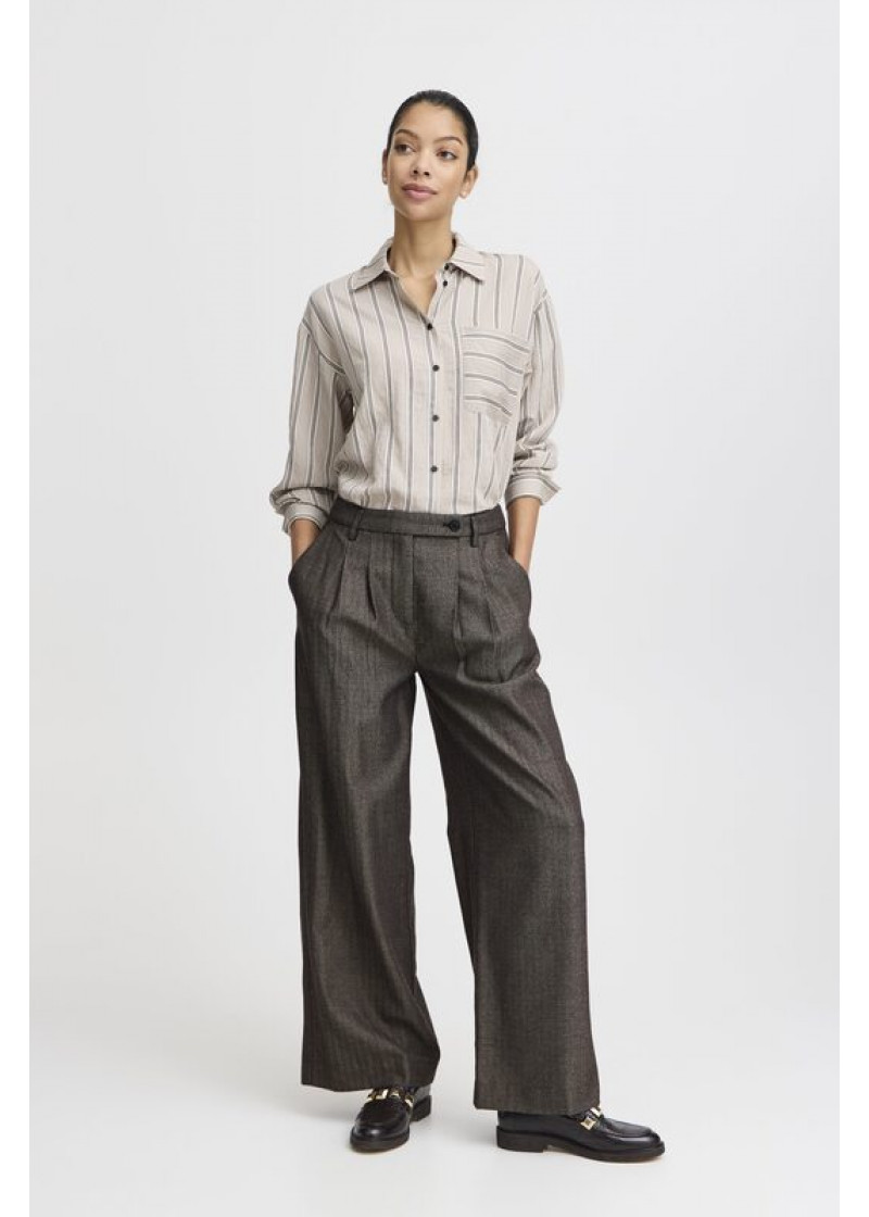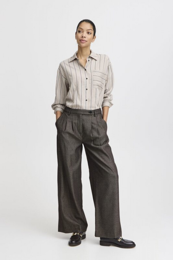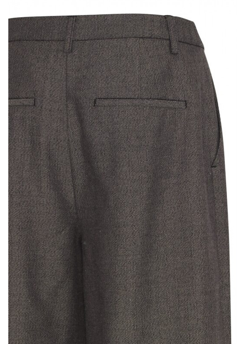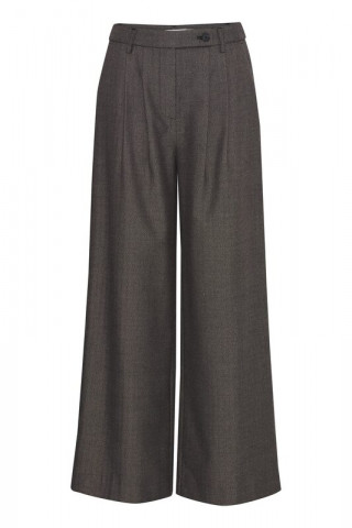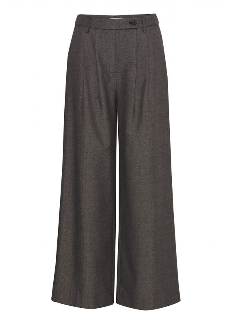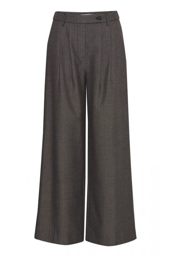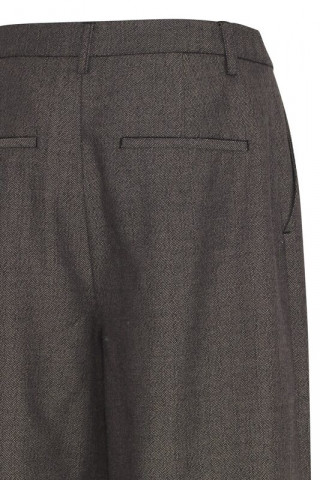 Opis: Ženske pantalone u sivoj boji sa širokim ravnim nogavicama, prednjim faltama i bočnim džepovima