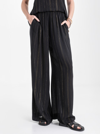 Opis: Ženski pantalone u crnoj boji sa lastiš pojasom i širokim nogavicama