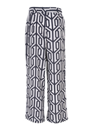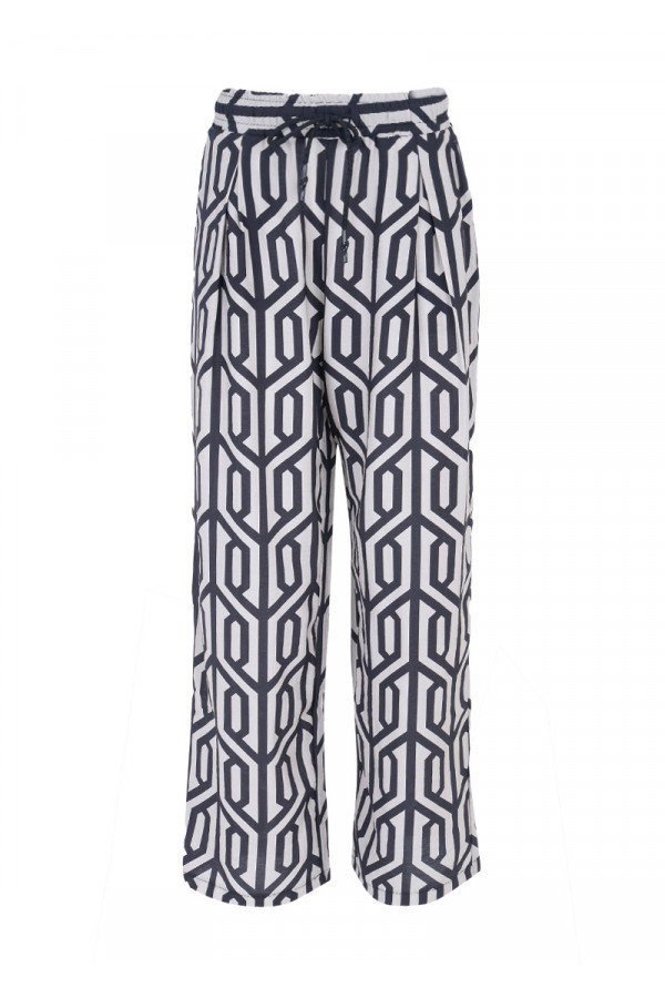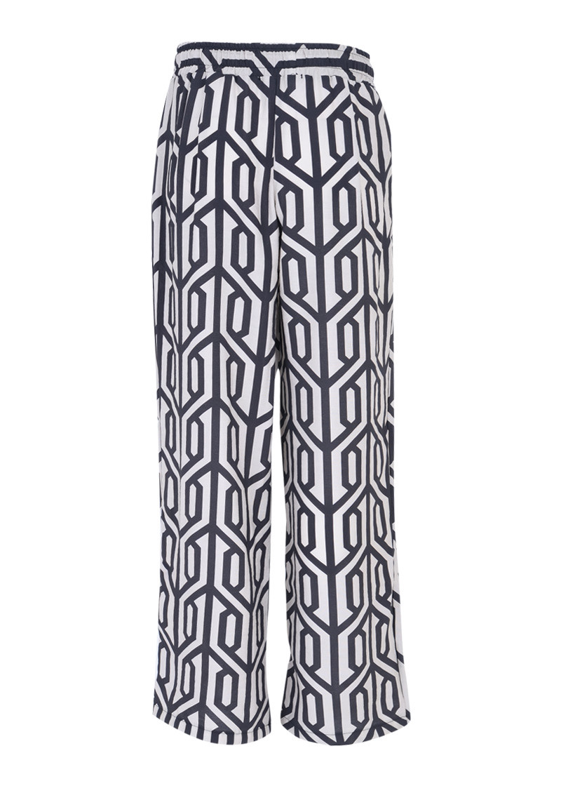 Opis: Ženske pantalone u bež-crnom geometrijskom printu sa lastiš pojasom i širokim nogavicama