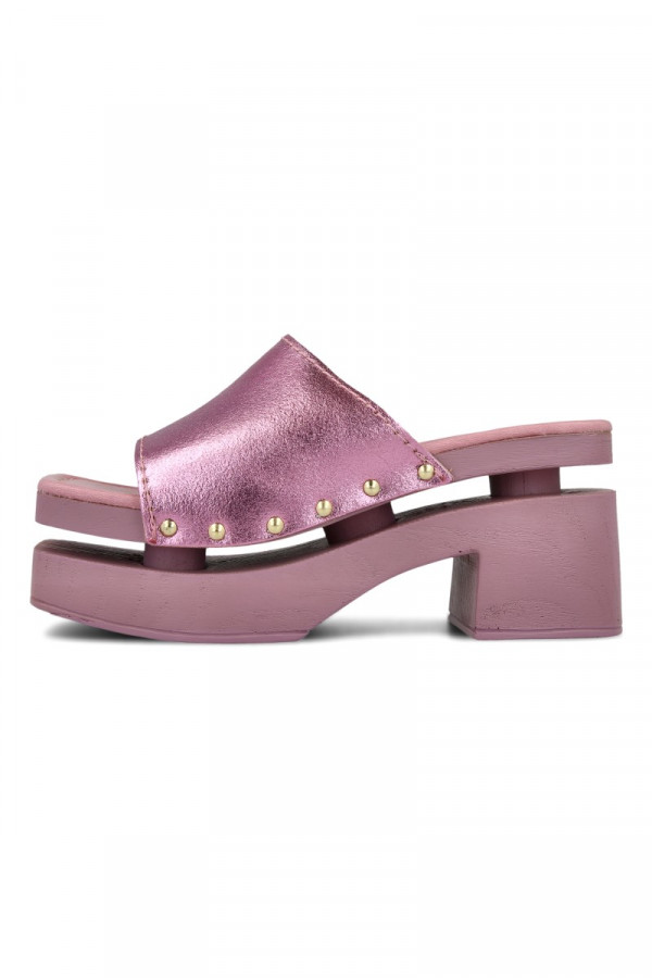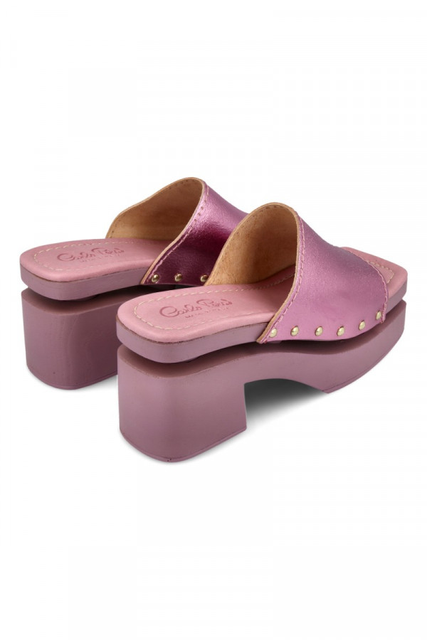 Opis: Kožne ženkse papuče u metalik lila boji sa autentičnim đonom i potpeticom visine 8,5 cm