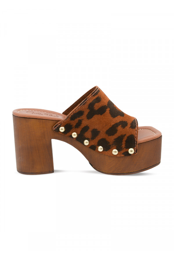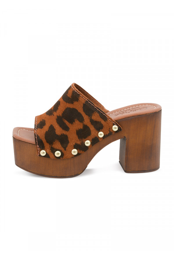 Opis: Kožne ženske papuče u animal printu sa bočnim nitnama, platformom i potpeticom visine 9,5 cm