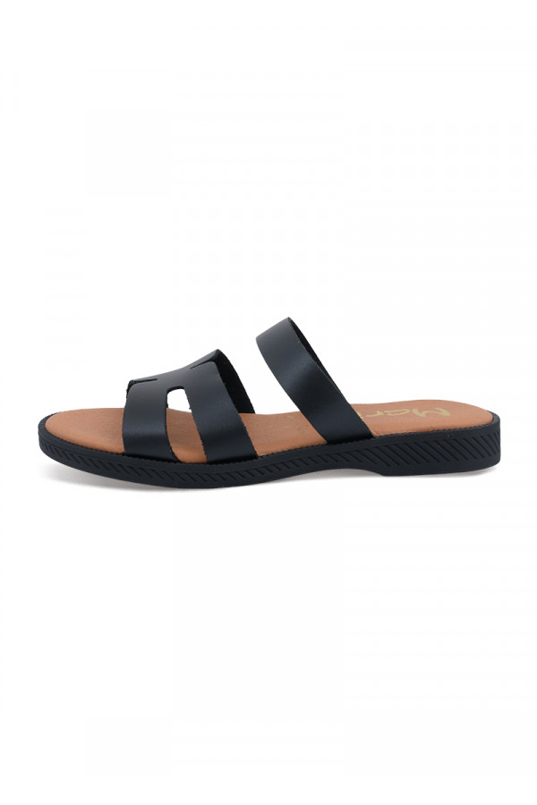 Opis; Kožne ženske ravne papuče sa kaiševima u crnoj boji