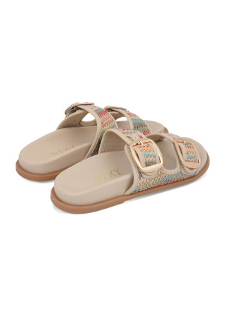 Opis: Kožne ženske ravne papuče u bež boji sa multicolor detaljima i širokim kaiševima