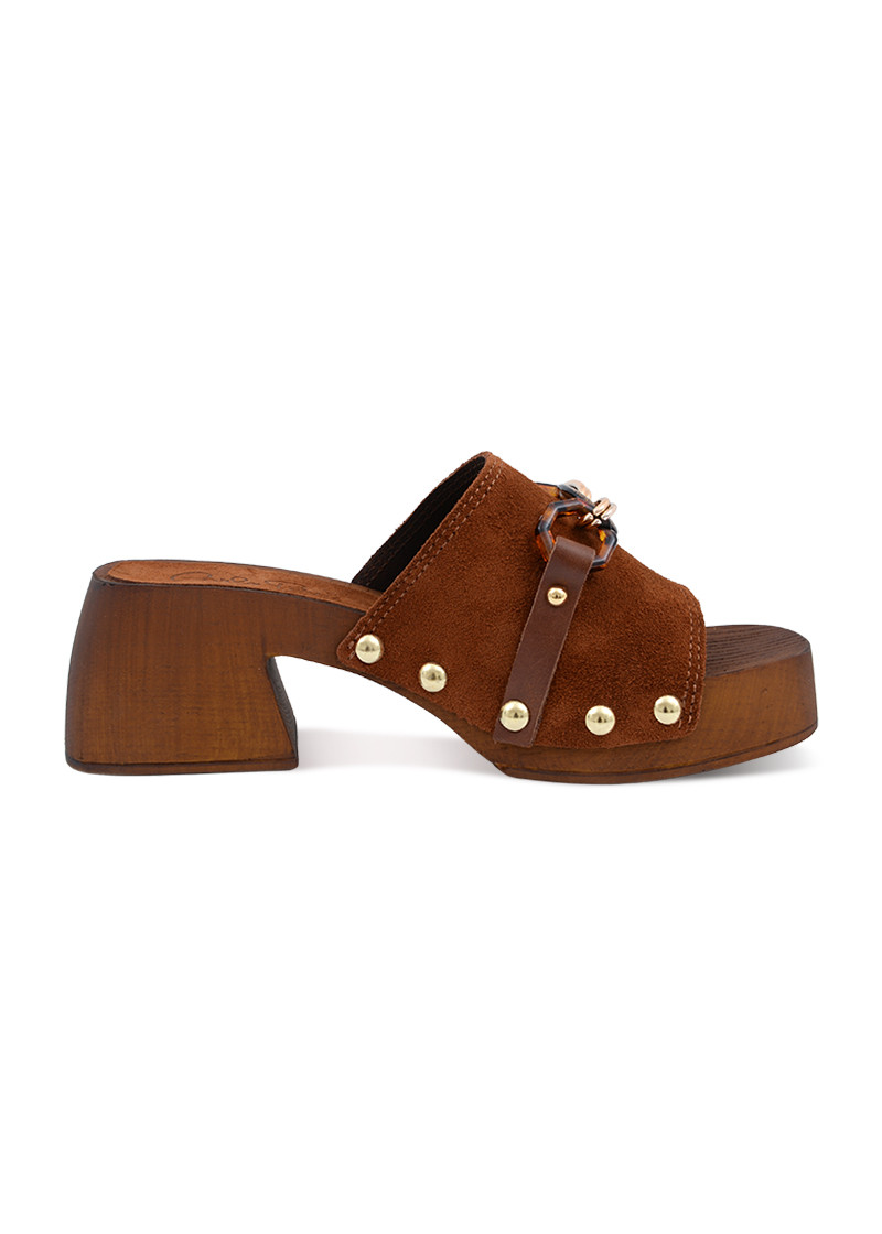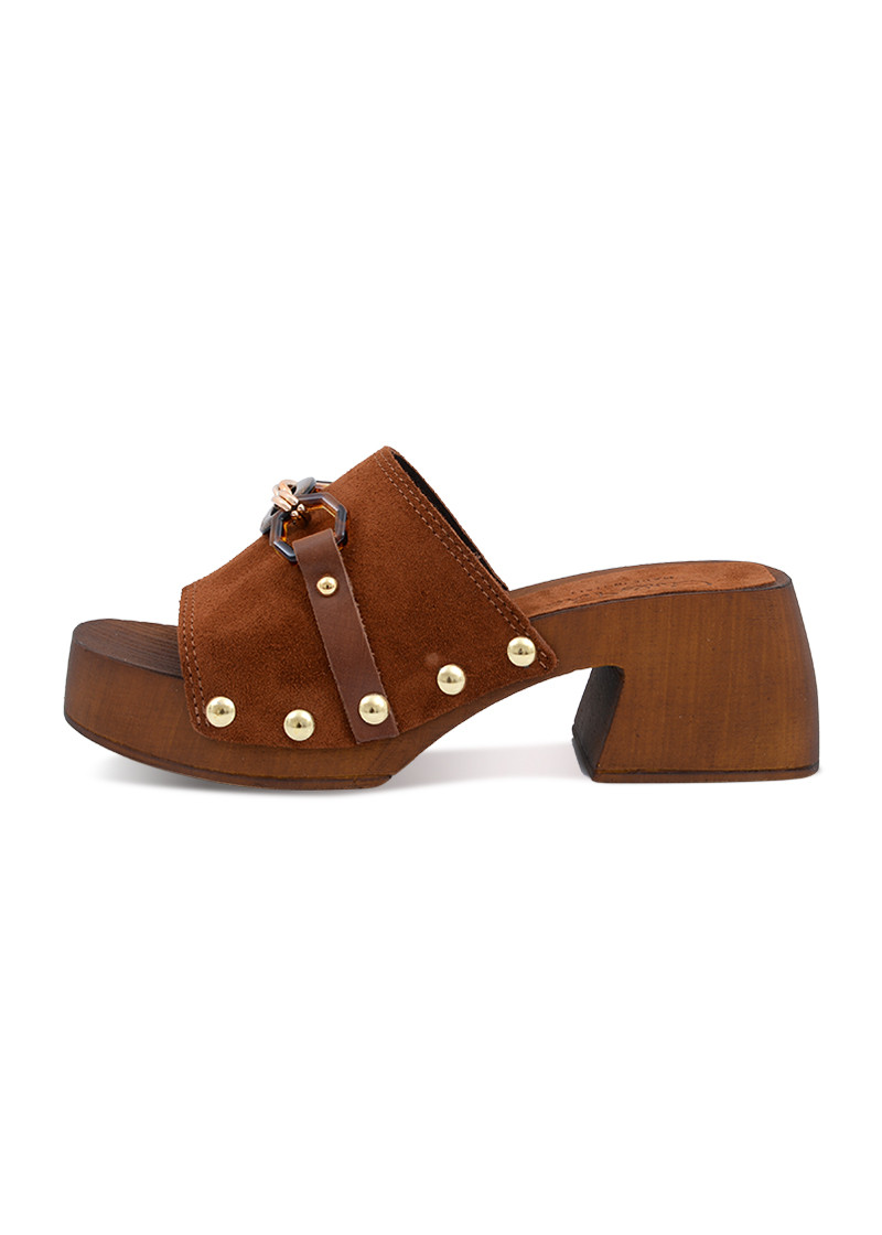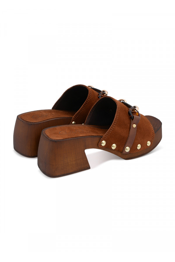 Opis: Kožne ženske papuče u braon boji sa platformomom i dekorativnim alkama
