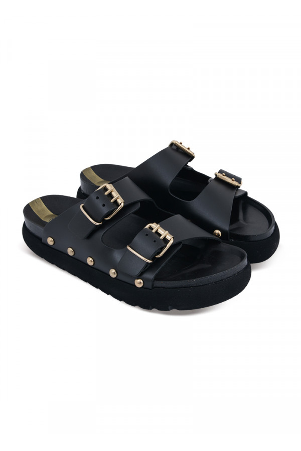 Opis: Kožne ženske ravne papuče u crnoj boji sa izdignutim platforma đonom, kaiševima i metalik zlatnim detaljima