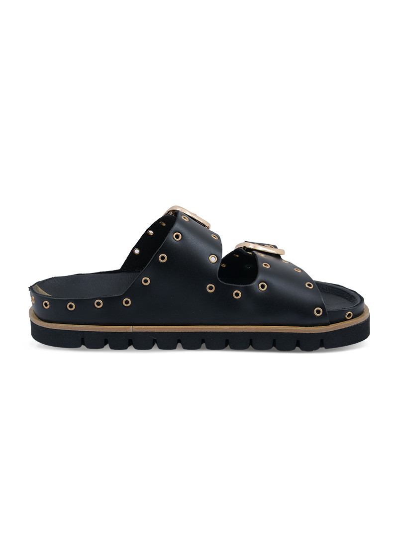 Opis: Kožne ženske ravne papuče u crnoj boji sa kaiševima i metalik zlatnim detaljima