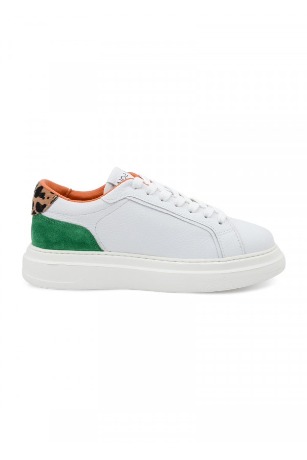 Opis: Kožne ženske patike u beloj boji sa animal rpint i zelenim detaljima