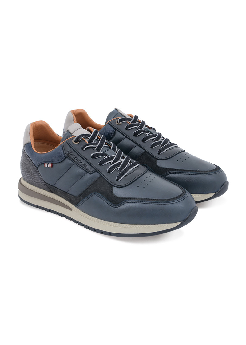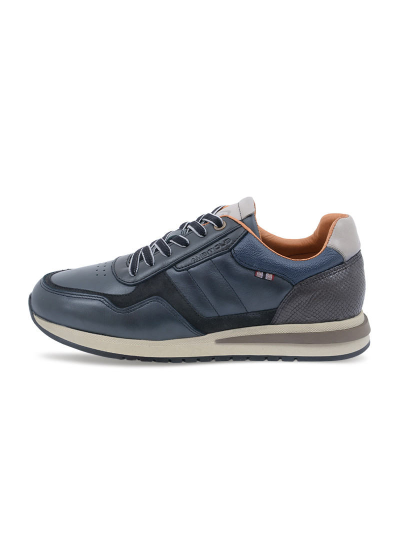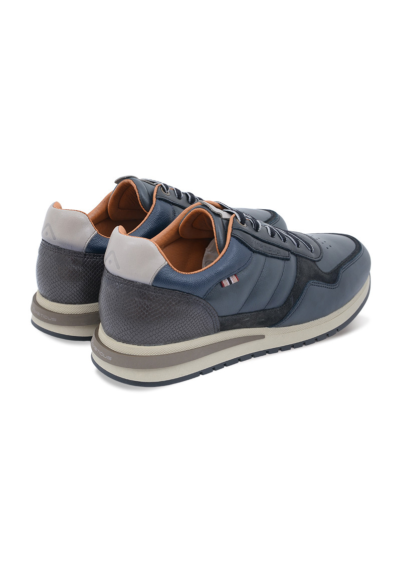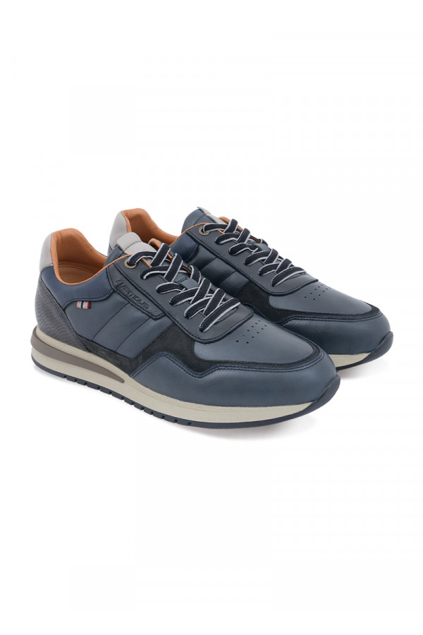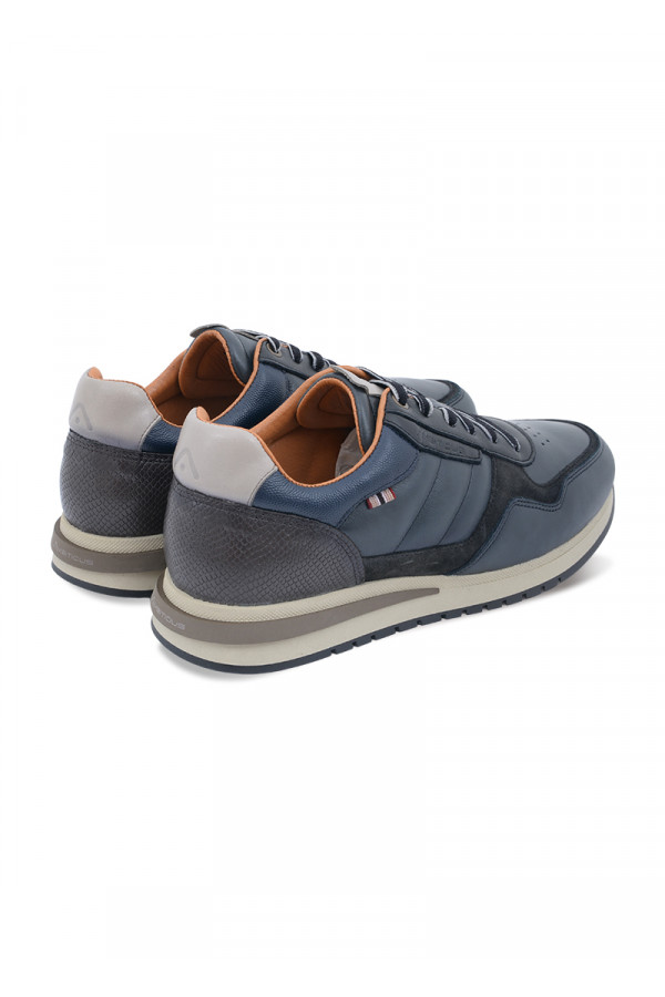 Opis: Kožne plitke muške patike u teget boji sa blago izdignutim đonom