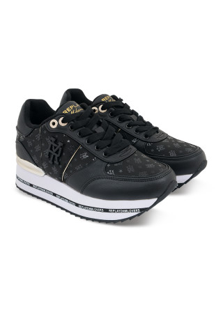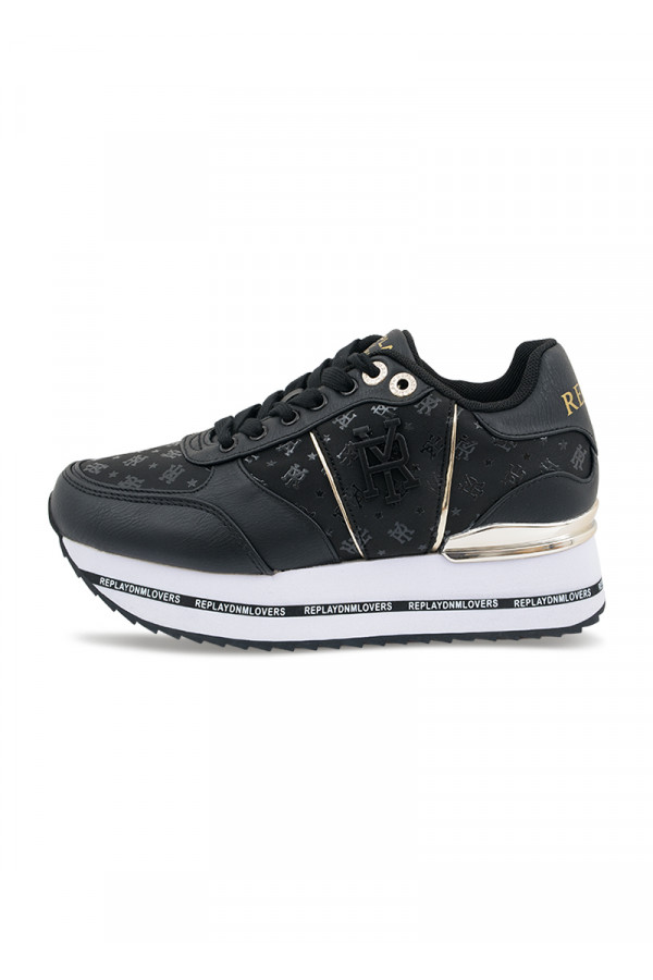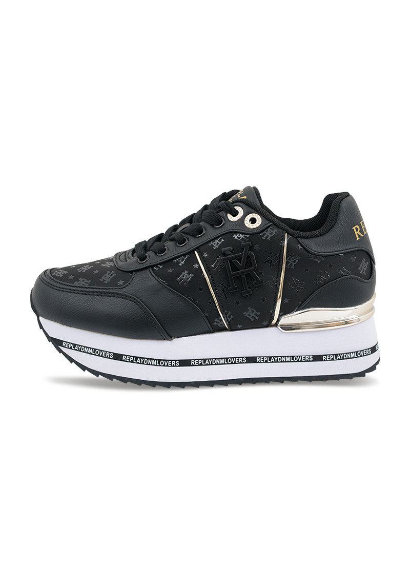 Opis: Plitke ženske patike u crnoj boji sa ravnom izdignutom platformom i zlatnim detaljima
