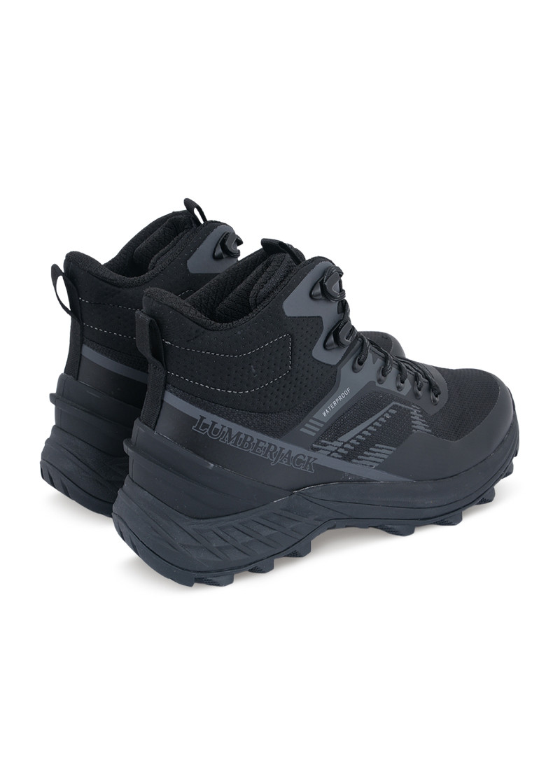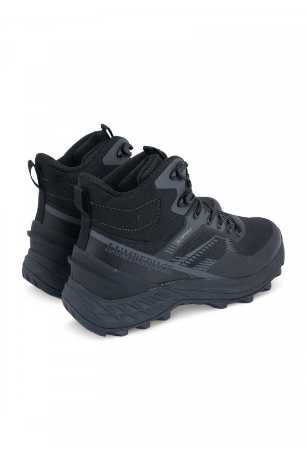 Opis: Vodootporne duboke muške patike u crnoj boji sa izdignutim đonom, dvobojnim pertlama i logo printom