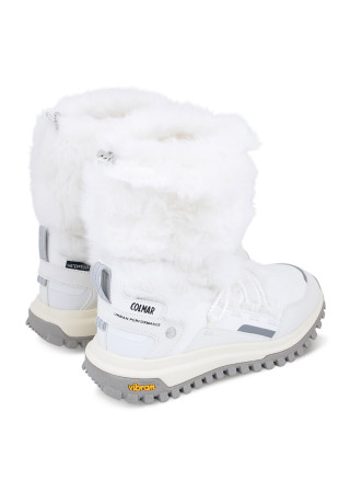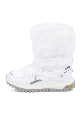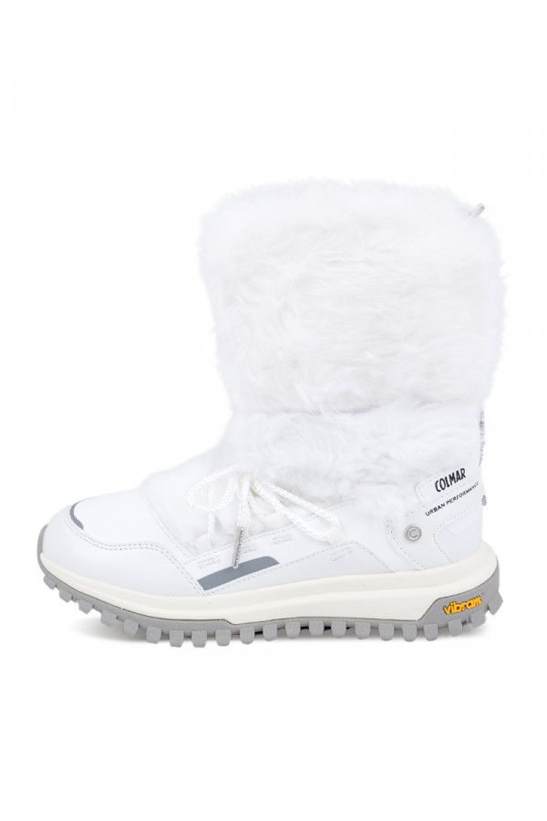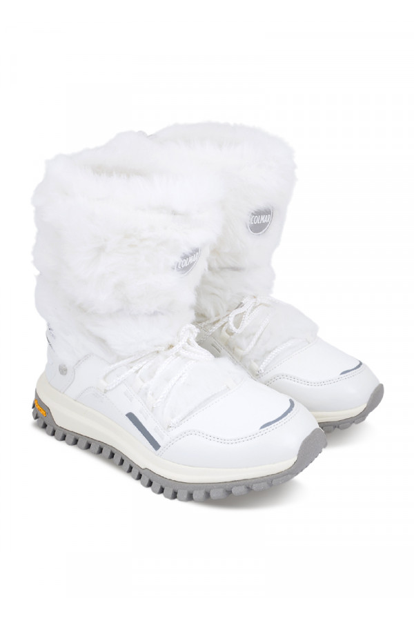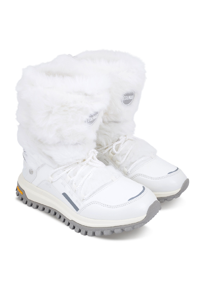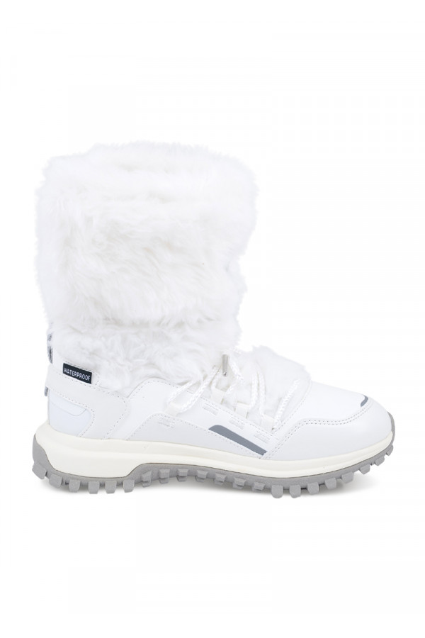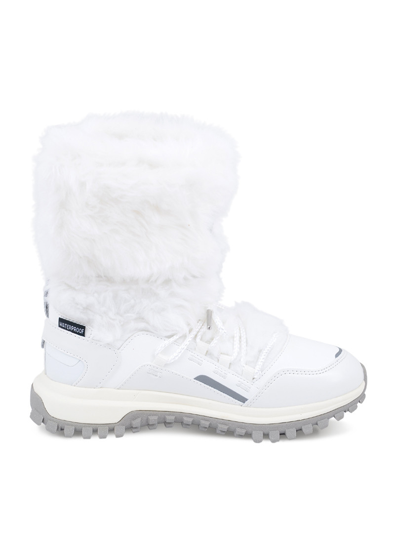 Opis: Vodootporne ženske ravne čizmeu beloj boji sa detaljima od krzna, pertlama i vibram đonom