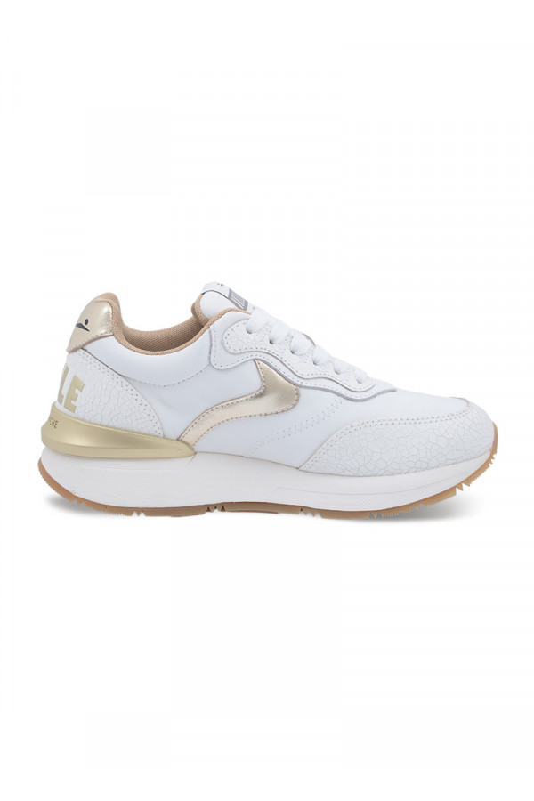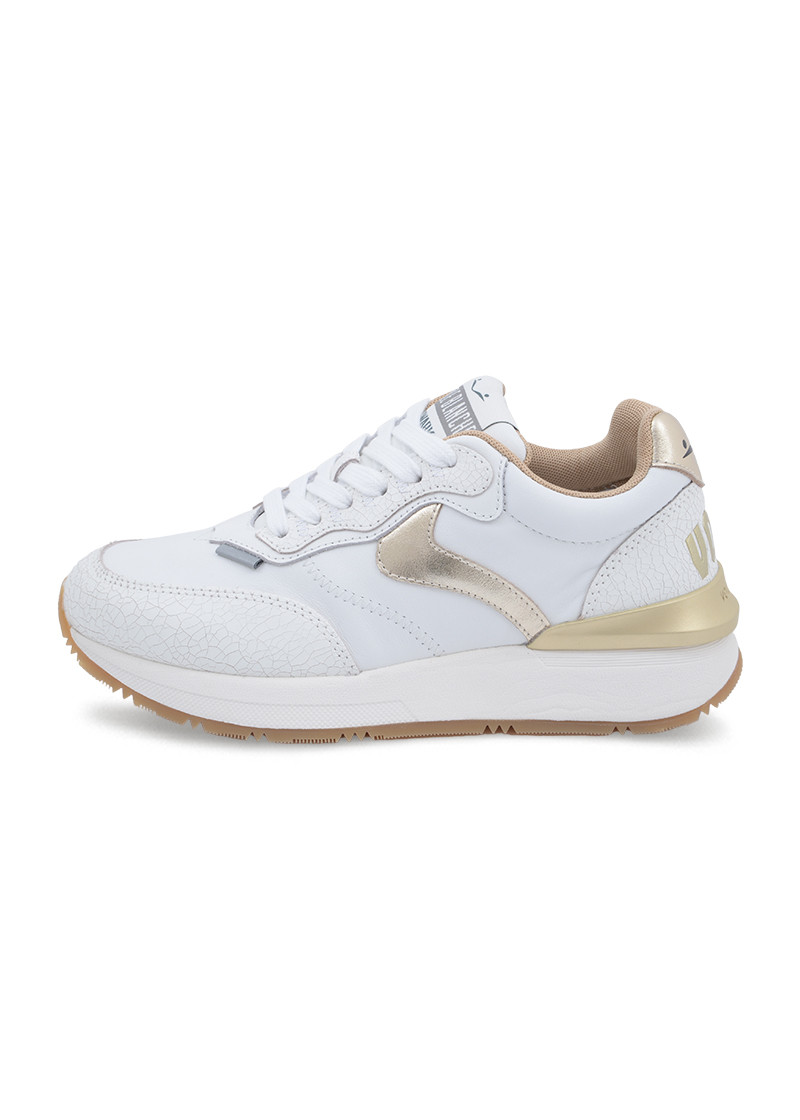 Opis: Kožne ženske plotke patike u beloj boji sa platina detaljima i blago naglašenim đonom