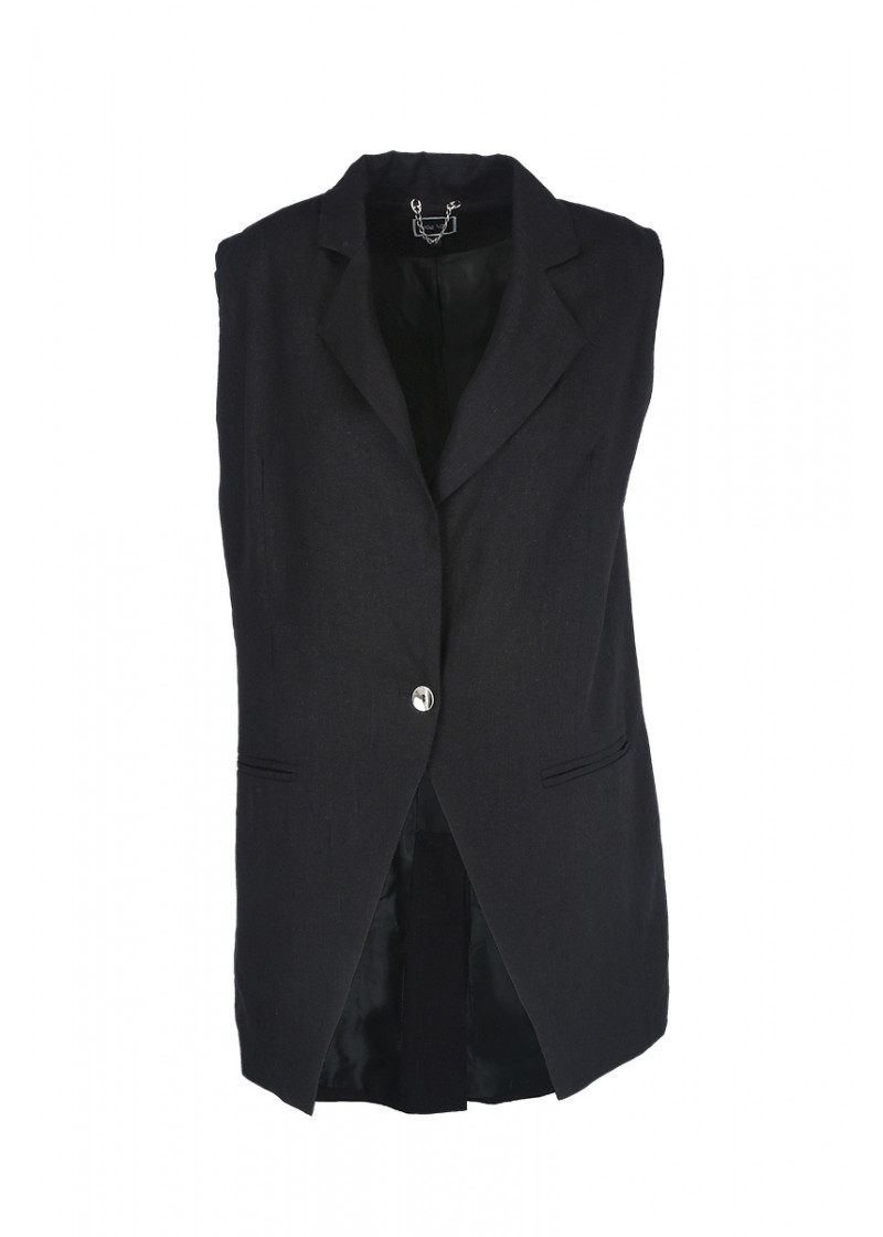 Opis: Ženski prsluk od prirodnog materijala u crnoj boji sa reverima, džepovima i zakoščavanjem na dugme