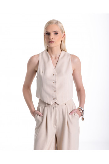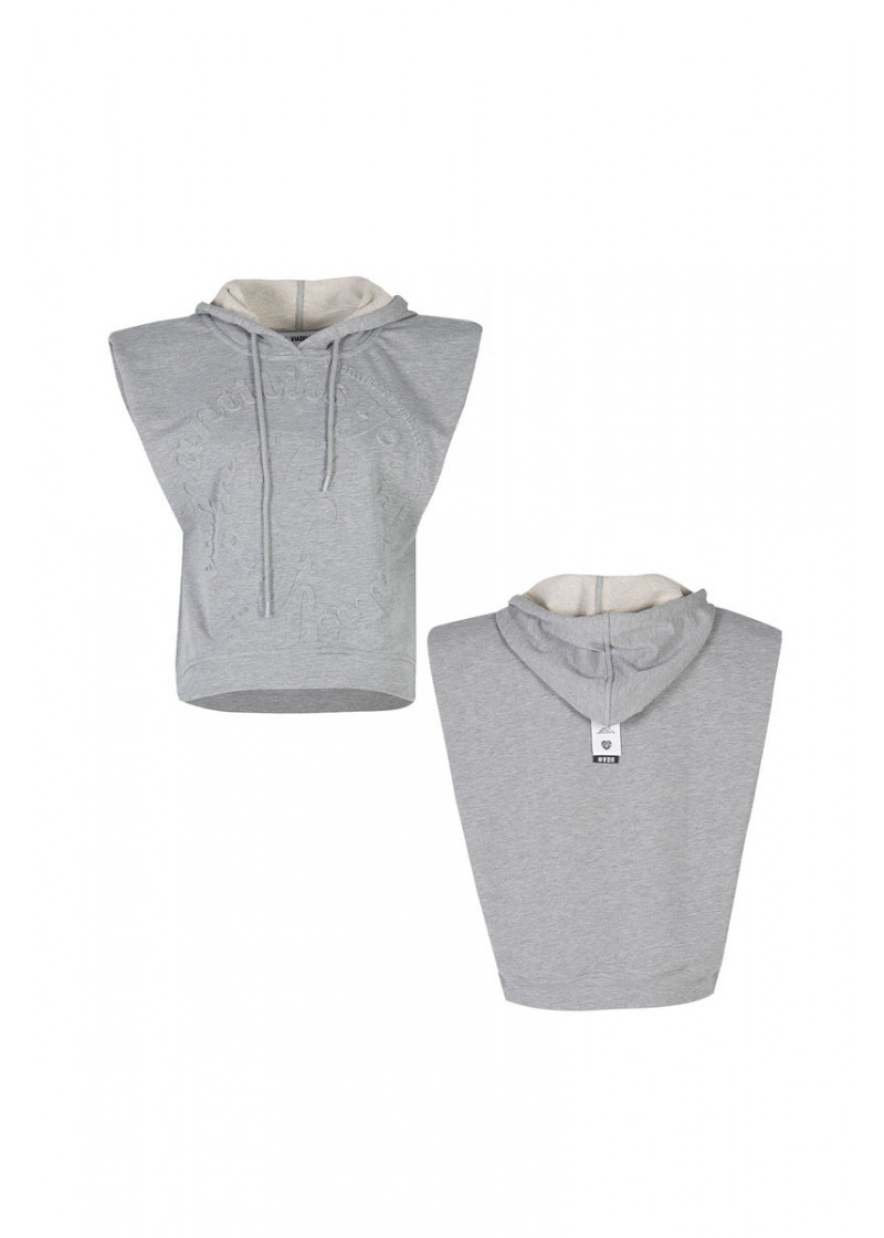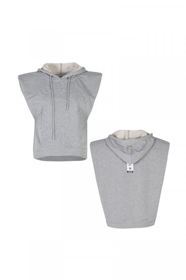 Opis: Ženski prsluk u svetlo sivoj boji sa naglašenim naramenicama i kapuljačom