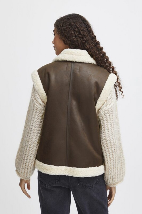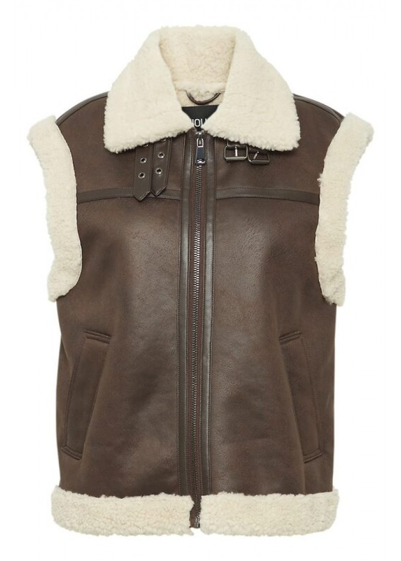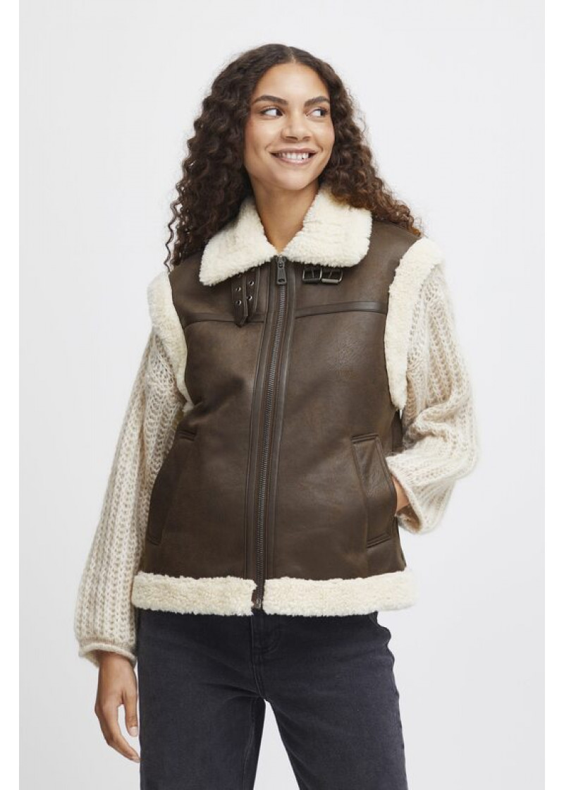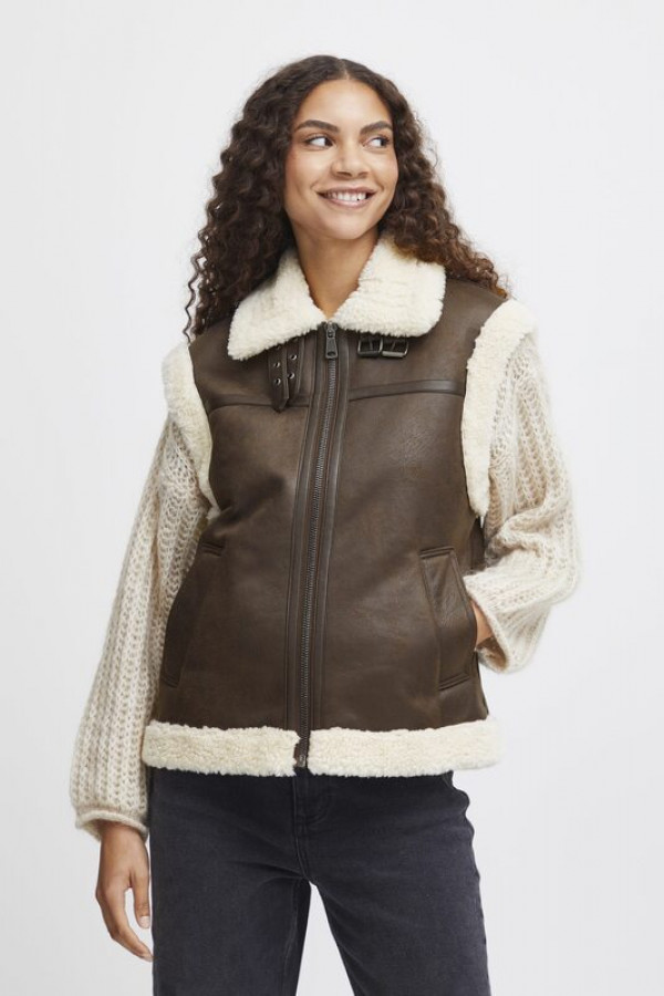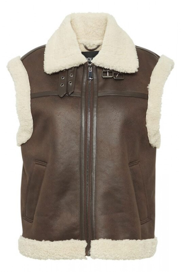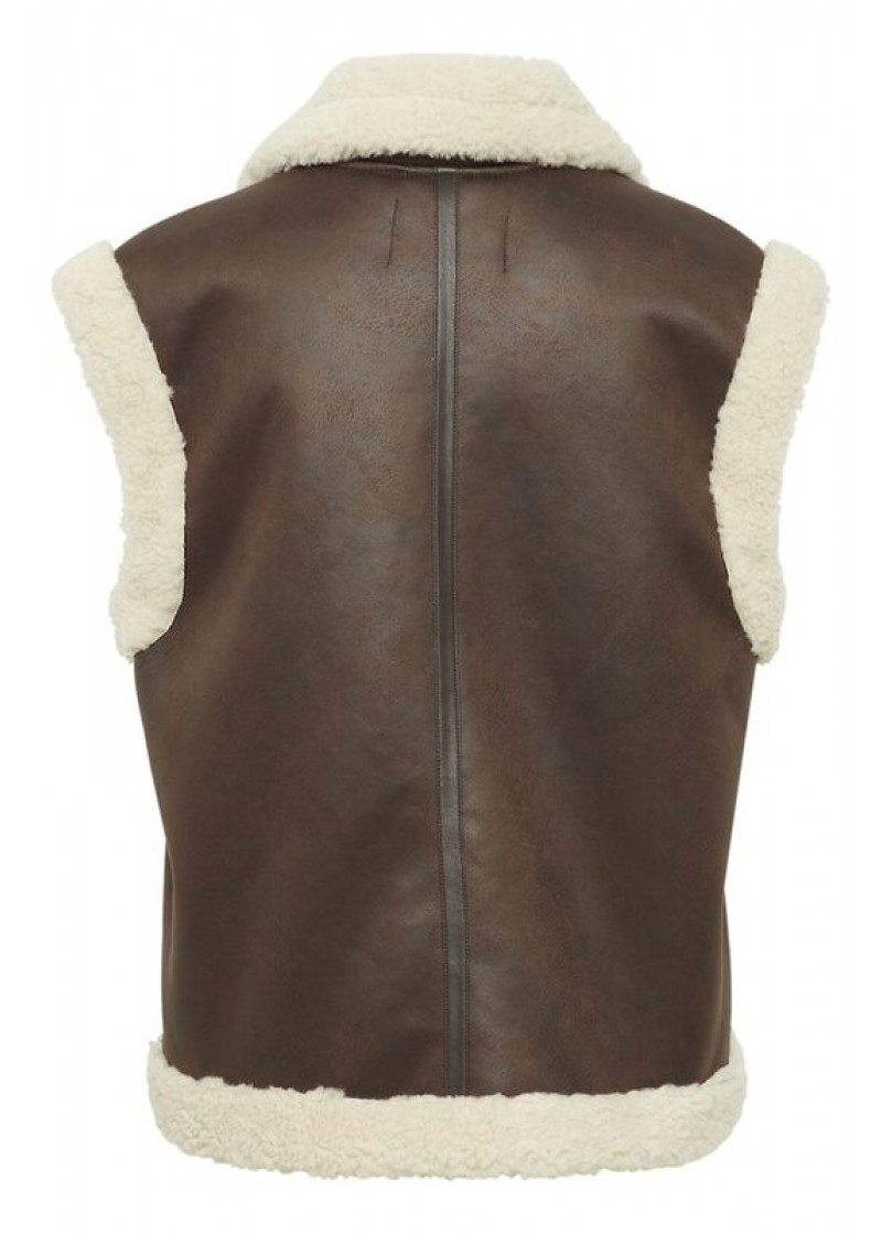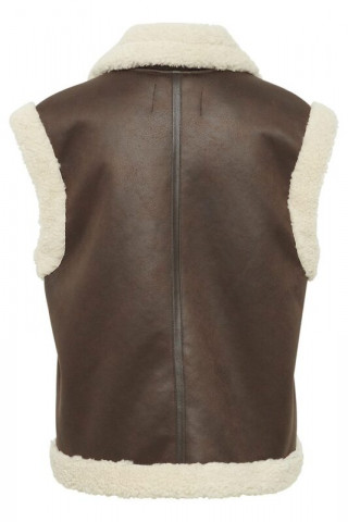 Opis: Kratak ženski prsluk u braon boji sa zipom, prednjim džepovima i detaljima od krzna