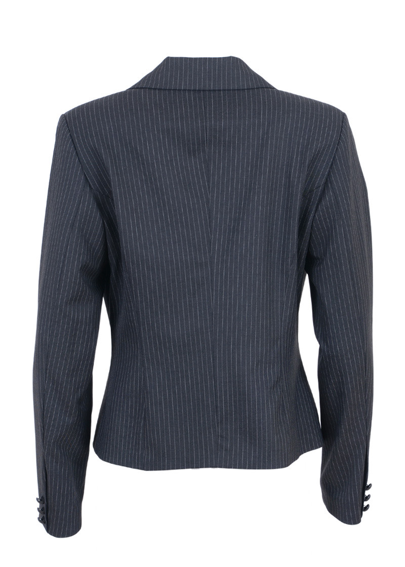 Opis: Kratak ženski sako u tamno sivom prugastom dezenu sa reverima