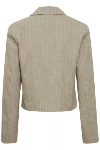Opis: Kratak ženski sako u bež prugastom dezenu sa reverima i dugmićima