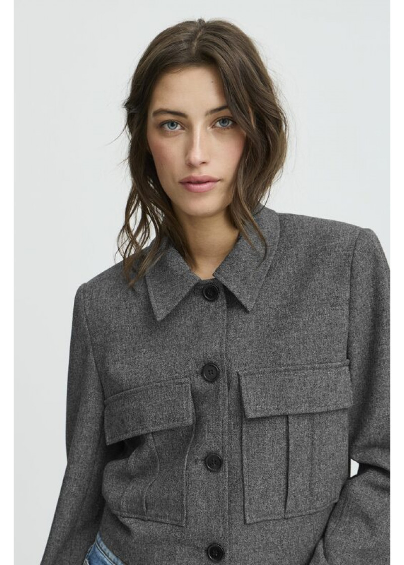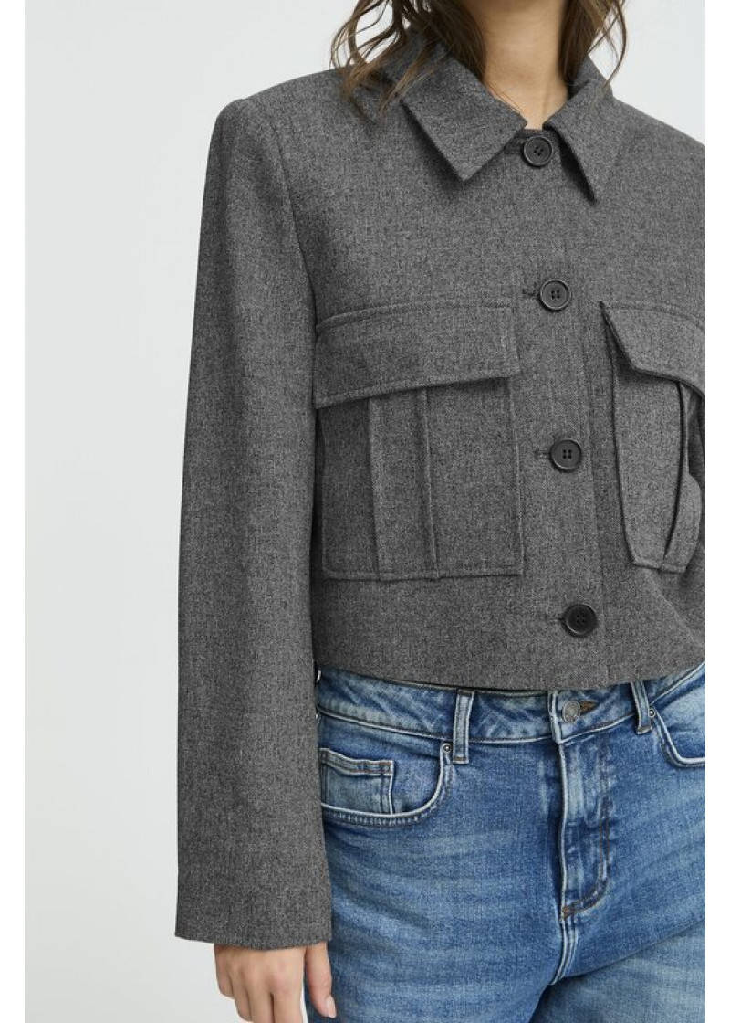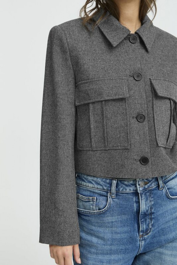 Opis: Kratak ženski sako u sivoj boji sa prednjim džepovima, kragnom i dugmićima