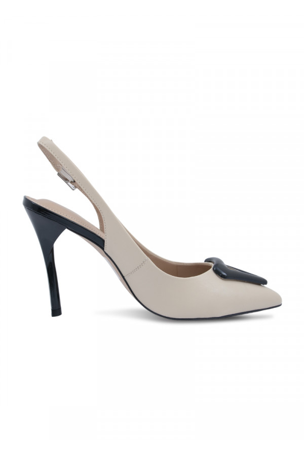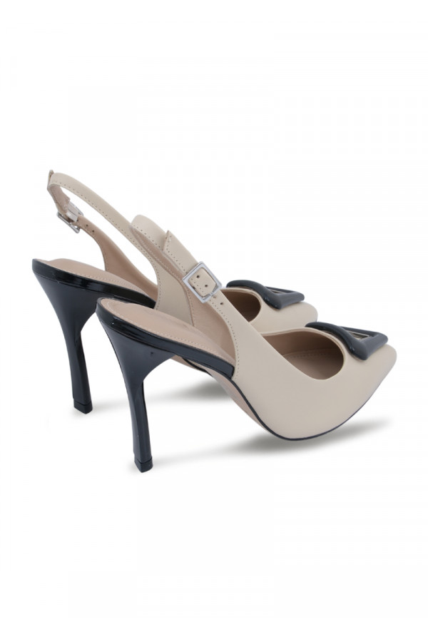 Opis: Kožne ženske sandale u puder boji sa crnim detaljima i otovrenom petom